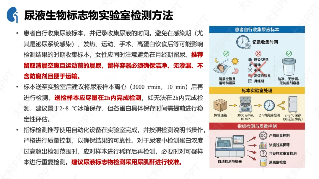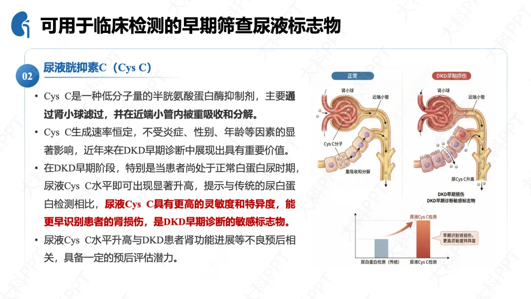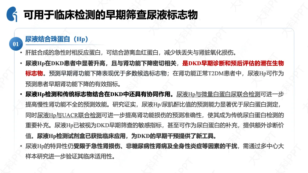 DKD 早期筛查生物标志物分临床可检测的尿液标志物和其他新型标志物,前者包含结合珠蛋白、胱抑素 C 等 8 种,分别反映肾小球或肾小管损伤,如结合珠蛋白可预测早期肾功能下降,与 UACR 联合能提升预测能力,转铁蛋白升高常早于白蛋白尿,是肾小球早期损伤的敏感指标。其他新型标志物有 KIM-1、TNFR-1/2 等,血浆和尿液中其水平与肾功能下降、DKD 进展密切相关,肝型脂肪酸结合蛋白也可提示早期 DKD。此外,组学技术为标志物开发提供新思路,CKD273 能预测无蛋白尿患者的 DKD 发生,但多数新型标志物检测依赖特殊设备、费用昂贵,参考值未标准化,还需更多循证医学证据支撑临床应用。(仅展示部分ppt)