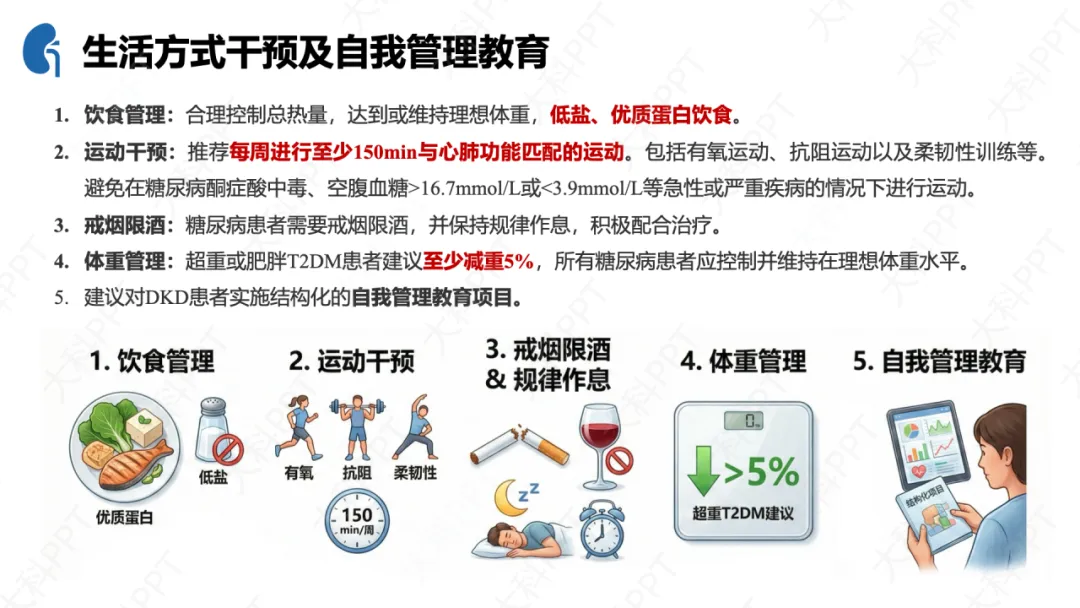 DKD 筛查后按检测结果分三类人群管理,指标阴性者侧重危险因素防控,每年至少筛查 1 次,同时指导饮食、运动等生活方式干预。UACR 和 eGFR 未达标但生物标志物阳性者,纳入 DKD 管理,优先使用心肾保护药物,动态监测相关指标。确诊患者采取综合管理策略,包括生活方式干预、内分泌科监测管理和肾内科转诊,生活方式需做到低盐优质蛋白饮食、每周 150min 运动、戒烟限酒等。内分泌科需对患者分期分级,监测 CKD 并发症和肾心预后风险,药物首选 SGLT2i、GLP-1RA 等有肾心获益的降糖药,控制血压 < 130/80mmHg、调脂用他汀类药物。患者出现 eGFR<30 或病因不明等情况时转诊肾内科,复杂病例需多学科协作。(仅展示部分ppt)