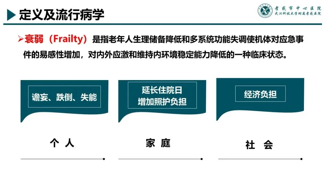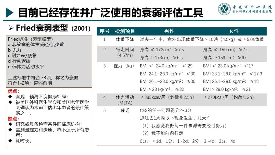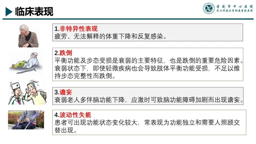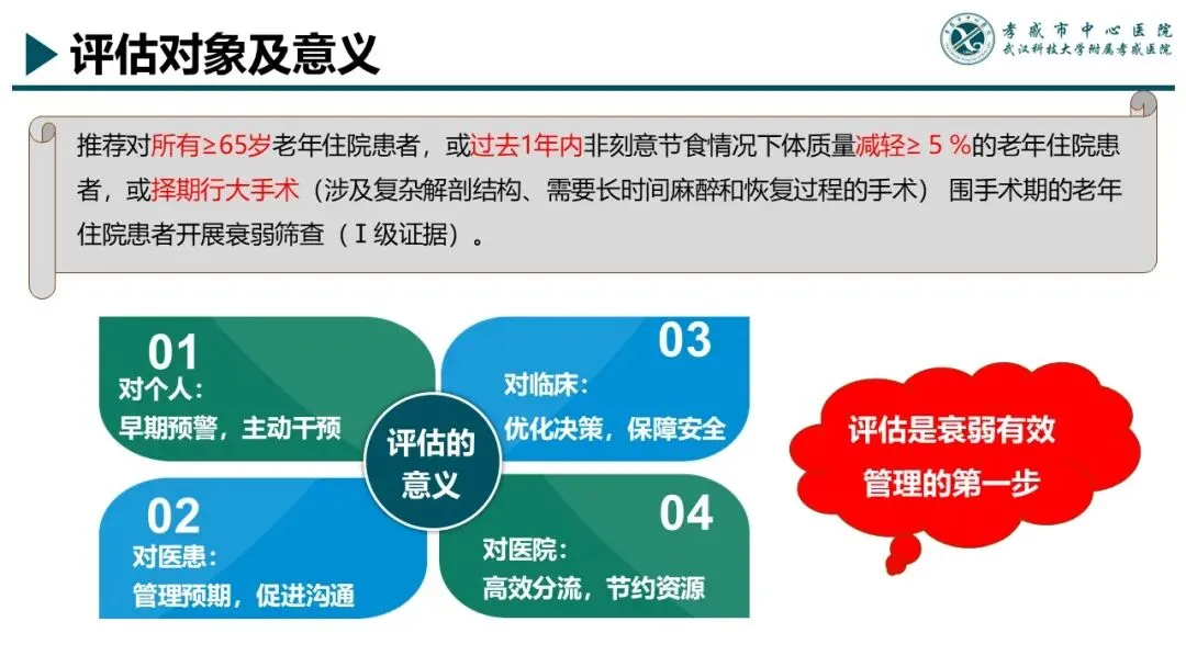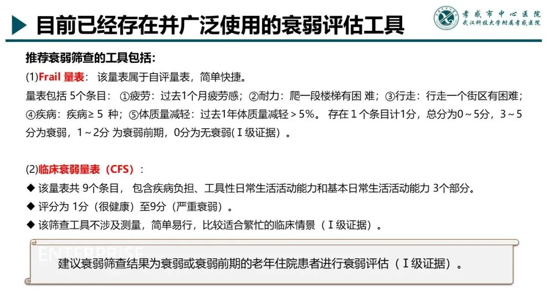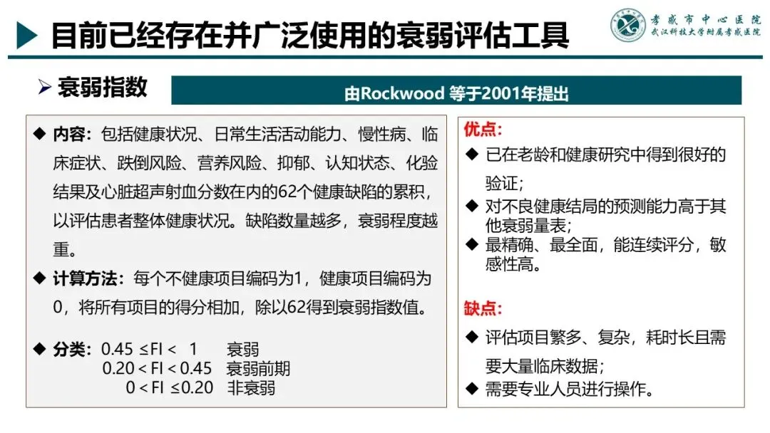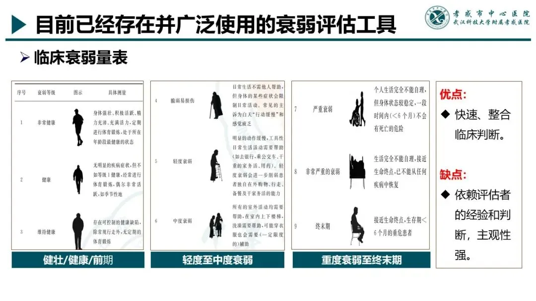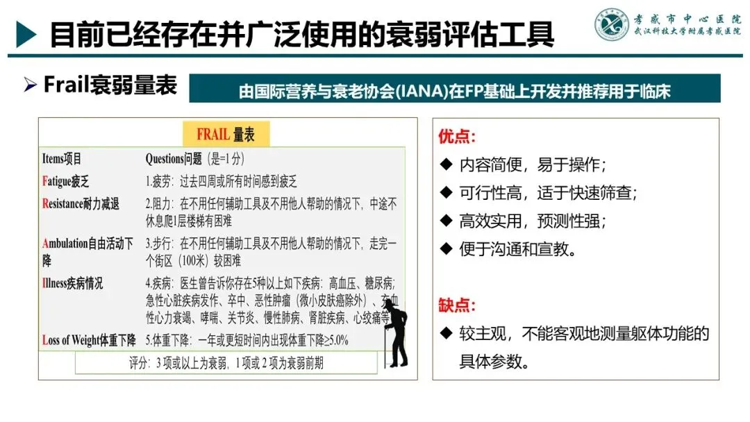 评估模块聚焦临床可及性,详细讲解Fried衰弱表型、临床衰弱量表(CFS)、FRAIL量表等工具的操作流程与结果解读,提供“床旁快速筛查-精准分级评估”的实用路径。