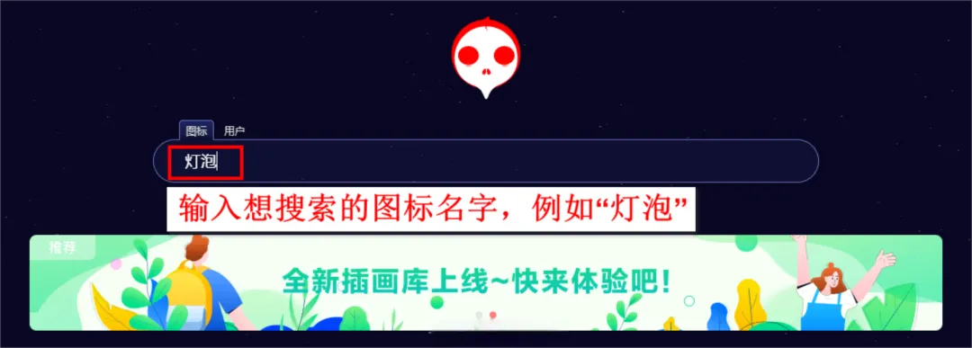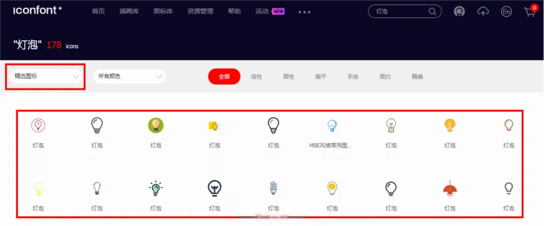 登录完成后,在搜索区内直接搜索想要下载的图标,例如我们要下载一个灯泡图标,可以直接输入灯泡,输入完成后按Enter回车键进行搜索。如下图: