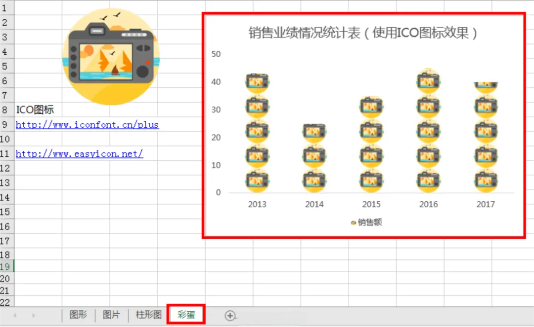 比如,本关素材中彩蛋工作表的图表,就是基于第2个工作表图片中的销售数据,使用ICO图表进行的美化,课后可以作为练习自己尝试一下哦: