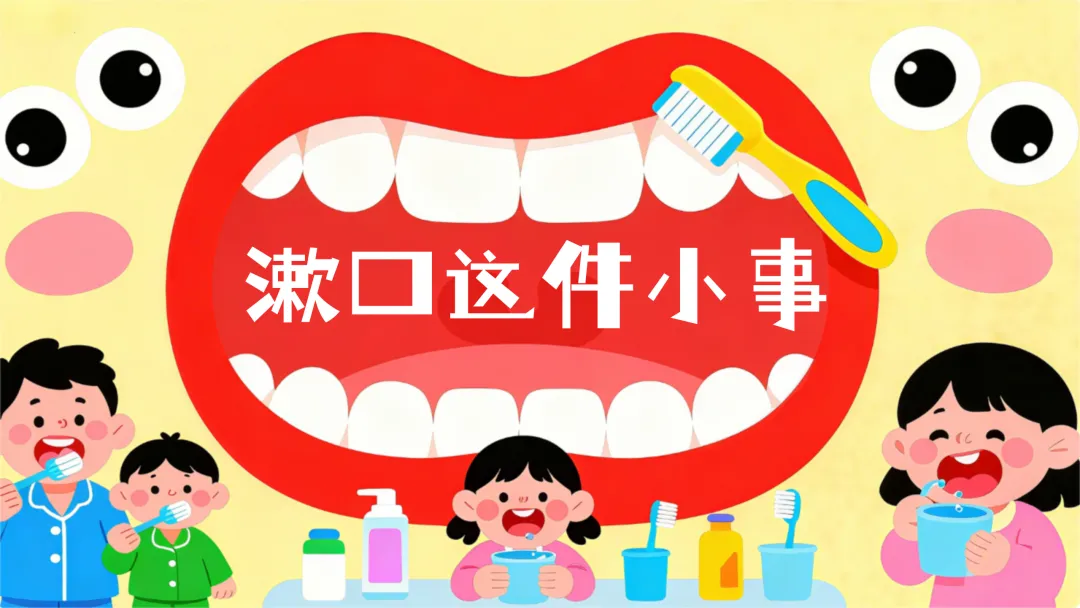 教师播放欢快的“漱口歌”,带领幼儿一起跟着音乐哼唱、做动作。