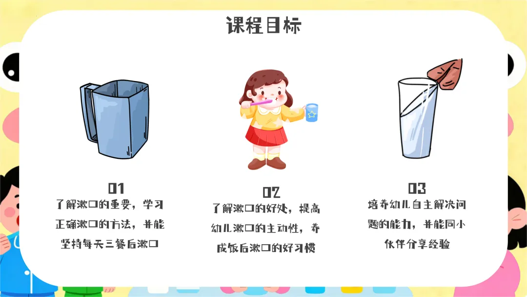 3、情感目标:增强对漱口的兴趣,养成自觉漱口的良好习惯。