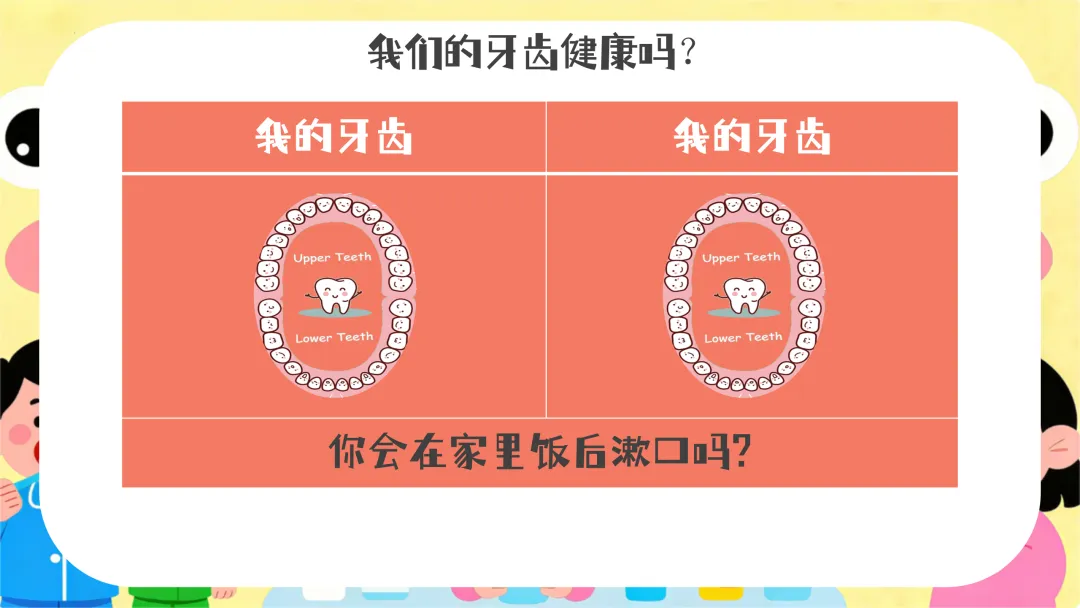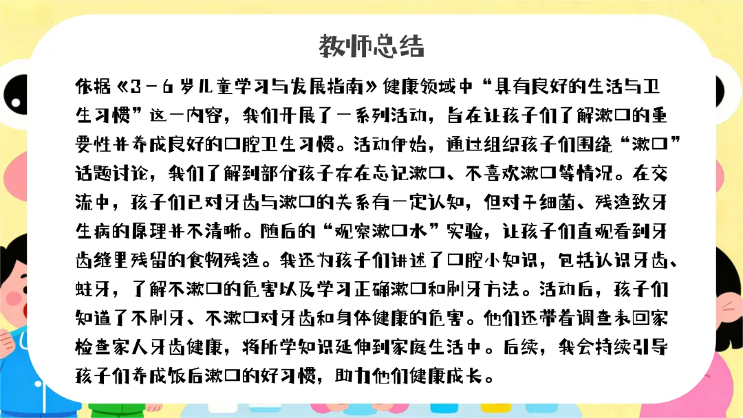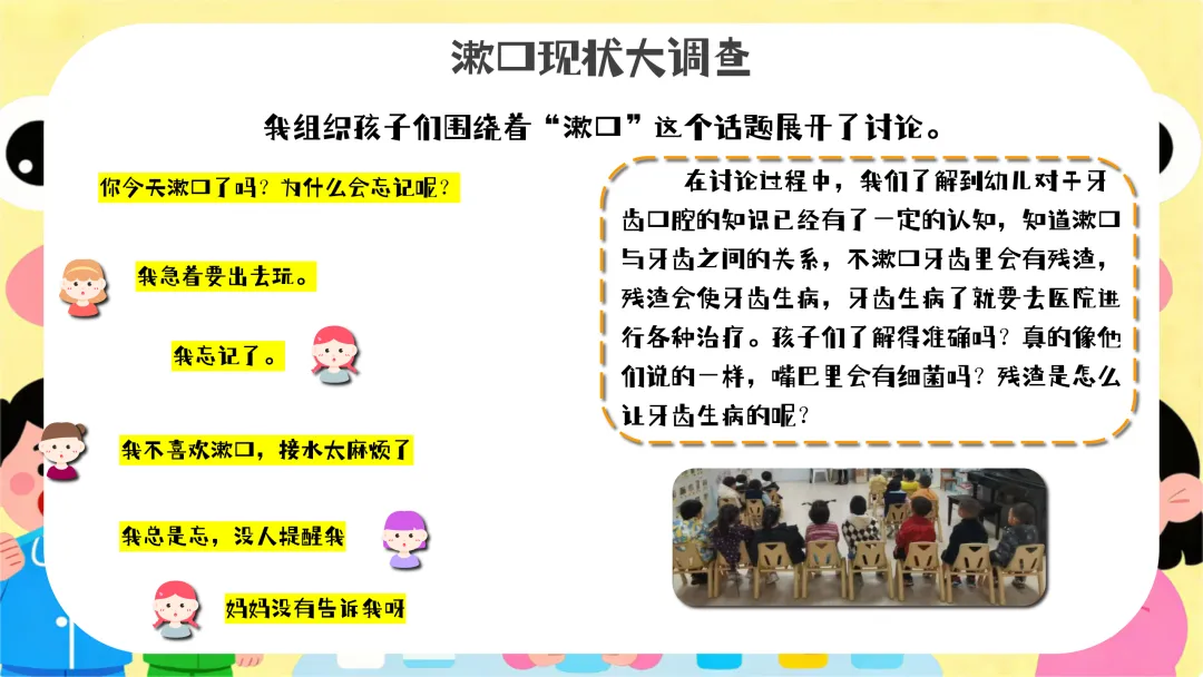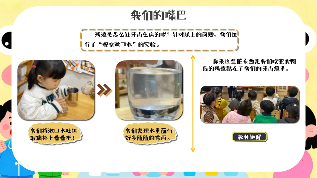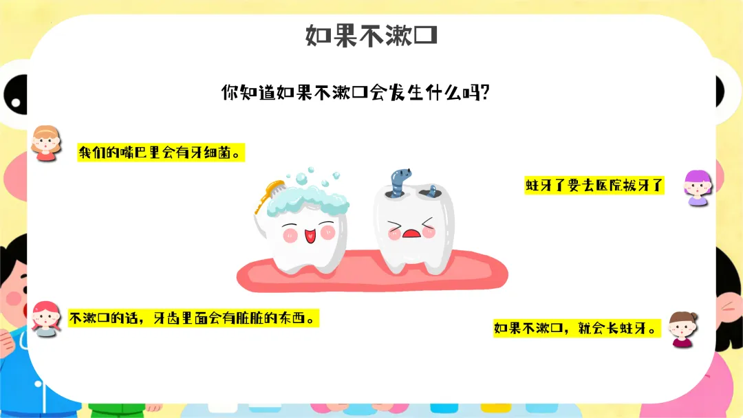 提问:“小朋友们,刚刚我们唱的是什么歌呀?那谁能告诉老师为什么要漱口呢?”引导幼儿回忆并回答。