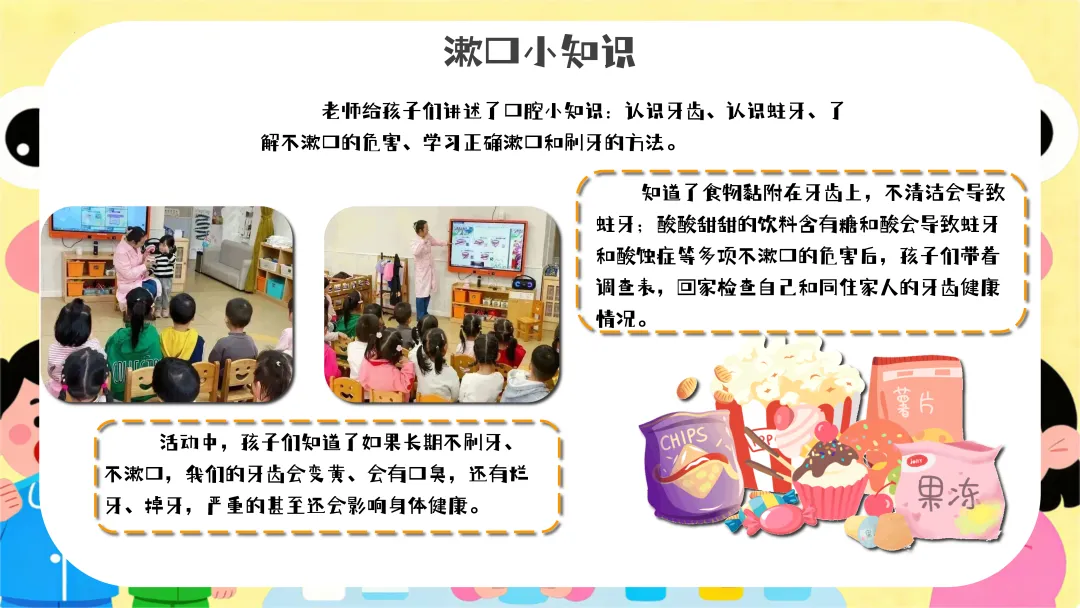 请幼儿回家后与家长一起制作一个更精美的漱口杯套,并坚持每天正确漱口。