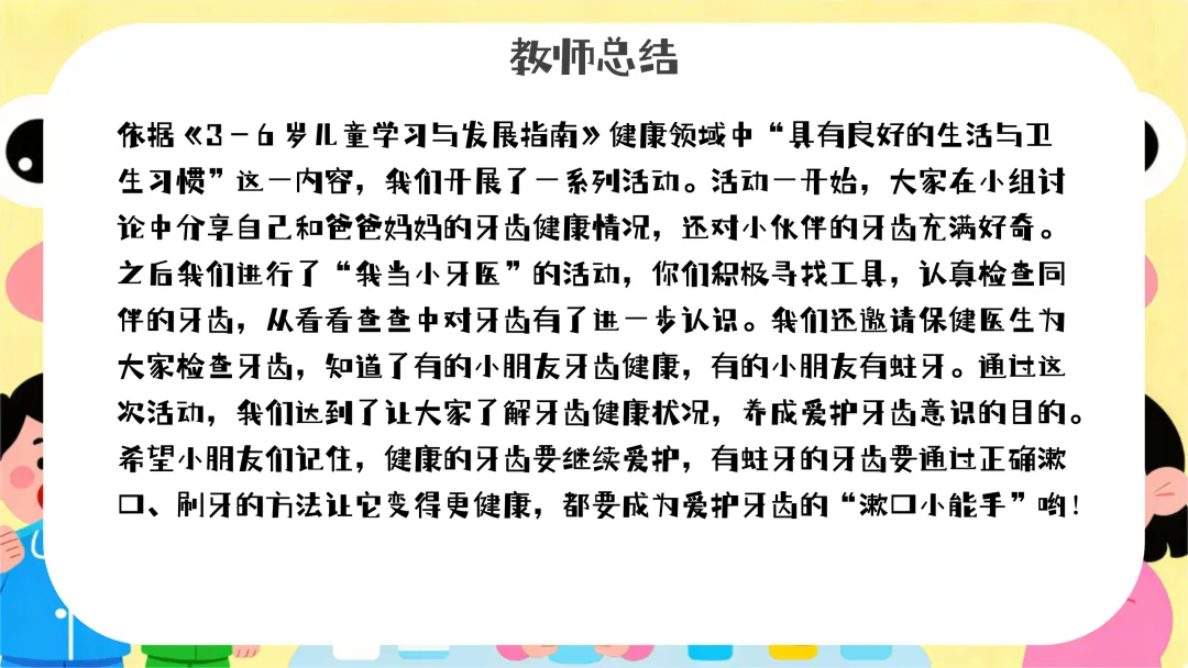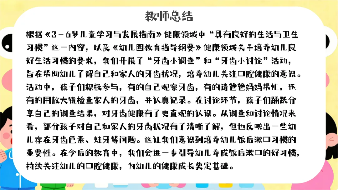 本次活动通过趣味的“装扮漱口杯”方式,成功吸引了幼儿的参与。在活动中,幼儿对创作杯套表现出了浓厚的兴趣,积极发挥想象力,锻炼了手部精细动作。大部分幼儿掌握了正确的漱口方法,对漱口的兴趣明显增强。但在活动过程中,也发现部分幼儿在创作时存在依赖心理,需要教师更多的引导和鼓励。在今后的活动中,应给予幼儿更多自主探索的空间,进一步培养他们的独立创作能力。