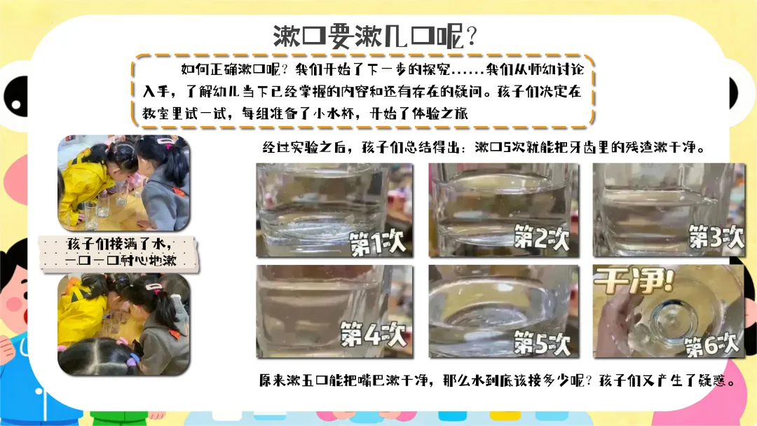 学习正确漱口方法(约10分钟):教师边示范边讲解正确的漱口方法:“小朋友们,先喝一口水,闭上嘴巴,咕噜咕噜,把水在嘴巴里漱几下,然后把水吐出来。”让幼儿跟着一起练习,教师巡回指导。提问:“谁能说一说刚刚是怎么漱口的呀?”