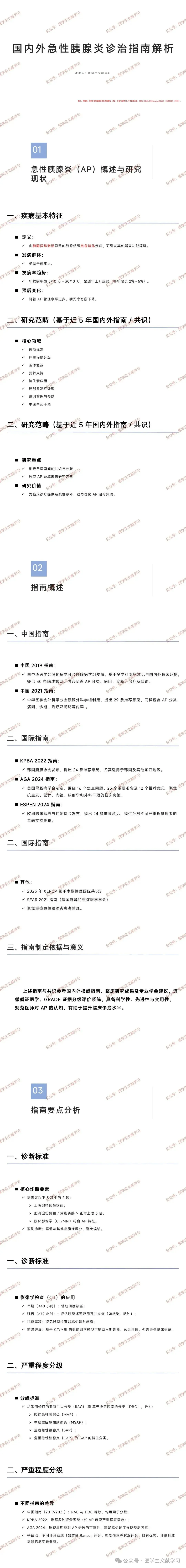 中国 2021 指南:中华医学会外科学分会胰腺外科学组制定,提出 29 条推荐意见,同样包含 AP 分类、病因、诊断、治疗及随访等内容。