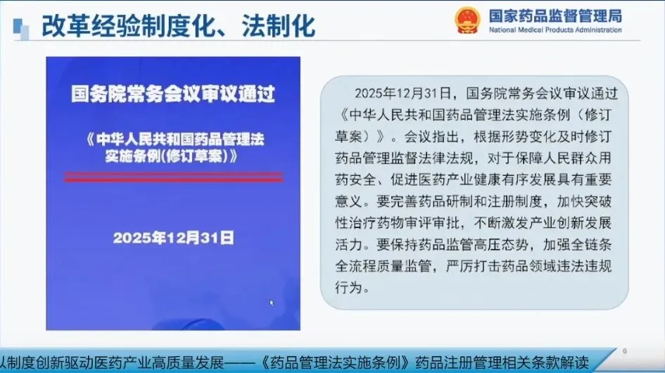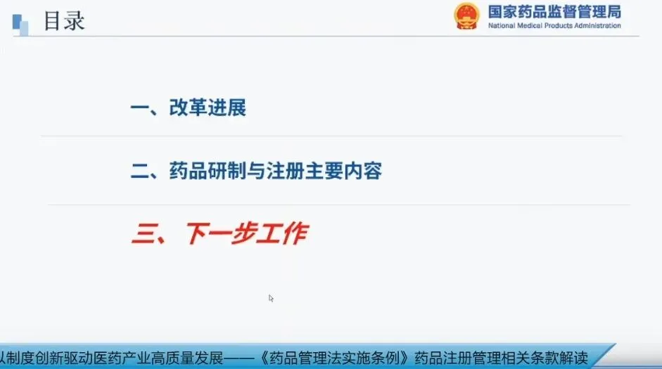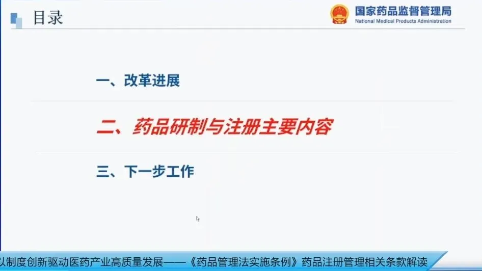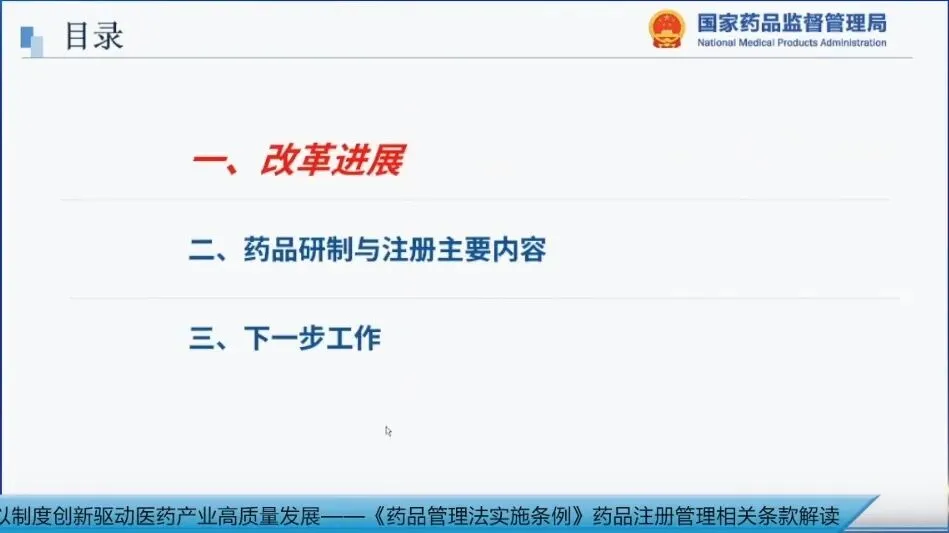 今天,我主要跟大家交流三方面的内容:一是改革的进展,二是条例中关于药品研制与注册的主要内容,三是下一步的工作。因时间关系,第一和第三部分我将简要介绍,重点讲解第二部分。