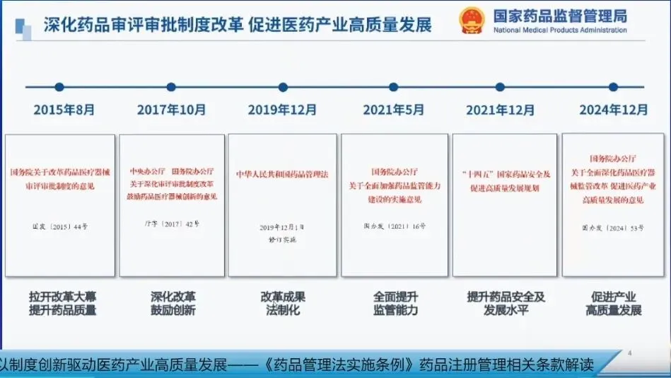 药品监管改革并非一蹴而就,早在2015年,国务院印发《关于改革药品医疗器械审评审批制度的意见》,就拉开了改革的大幕。随后,2017年,中办、国办印发《关于深化审评审批制度改革鼓励药品医疗器械创新的意见》;2019年,《疫苗管理法》和《药品管理法》相继出台;2021年,国办印发《关于全面加强药品监管能力建设的实施意见》,同年制定《“十四五”国家药品安全及促进高质量发展规划》;2024年底,国务院办公厅印发《全面深化药品医疗器械改革促进医药产业高质量发展的意见》。