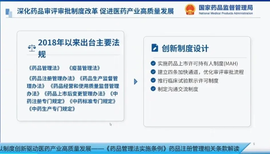 从这些文件可以看出,我国的药品监管改革从未停滞,始终在持续推进、不断深化。2018年国家药监局新组建以来,法治建设不断加速,为配套《疫苗管理法》和《药品管理法》的颁布实施,专门制修订了《药品注册管理办法》《药品生产监督管理办法》《药品经营和使用质量监督管理办法》《药品上市后变更管理办法》,以及中药注册、标准、生产三个专门规定。