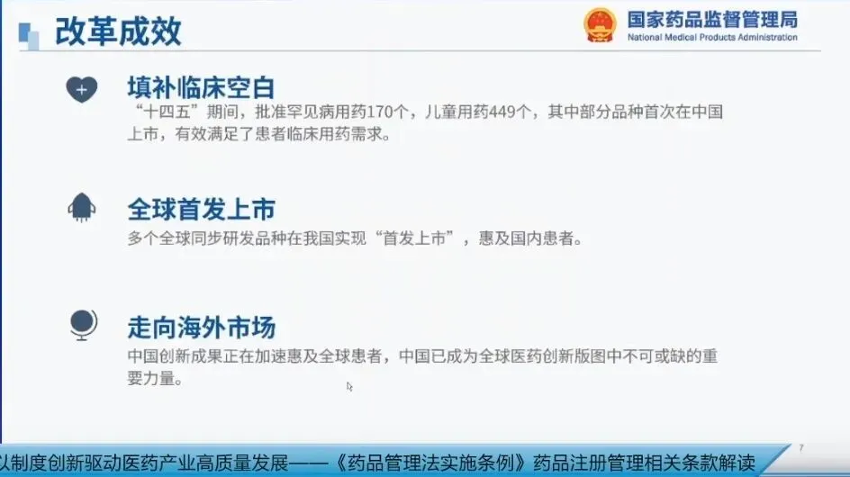 经过多年努力,改革取得了显著成效:“十四五”期间,共批准罕见病用药170个、儿童用药449个,其中部分品种首次在中国上市,有效满足患者临床用药需求,填补了临床空白;同时,多个全球同步研发的新药品种在我国实现首发上市,惠及国内患者,中国创新成果正在加速走向海外市场,惠及全球患者,中国已成为全球医药创新版图中不可或缺的重要力量。