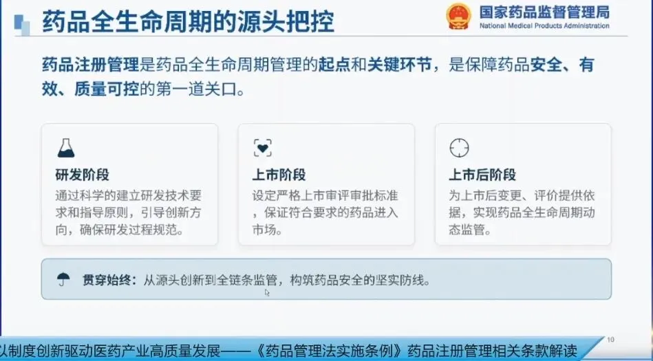 药品注册管理是药品全生命周期管理的起点和关键环节,是保障药品安全有效、质量可控的第一道关口。药品注册环节主要包括研发阶段、上市阶段和上市后阶段:在研发阶段,通过建立科学的研发技术要求和指导原则,引导创新方向,确保研发过程持续规范;在上市阶段,通过设定严格的上市审评审批标准,保证符合要求的药品进入市场;在上市后阶段,为上市后变更评价提供依据,实现药品全生命周期的动态监管。