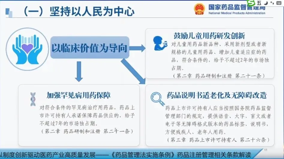 药品监管工作始终坚持人民至上、生命至上的原则,以增强人民群众获得感、幸福感、安全感为根本出发点和落脚点。条例立足于满足人民群众用药需求,关注儿童患者、罕见病患者、老年患者用药权益的保障,对鼓励儿童用药品研发创新、加强罕见病药品保障,以及药品说明书适老化和无障碍改造等内容,都用专门章节进行了规定,彰显了药品监管以人民为中心的管理理念。