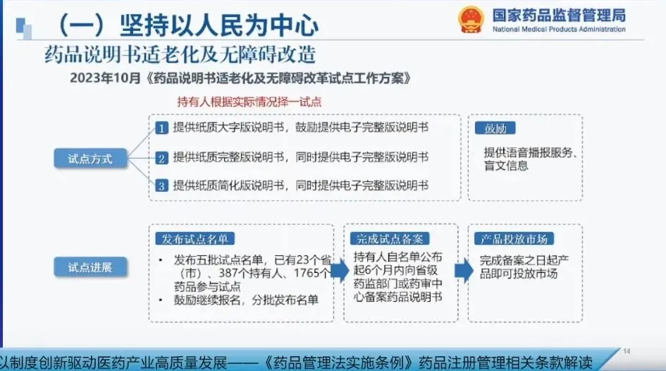 自2023年10月发布《药品说明书适老化及无障碍改革试点工作的方案》以来,业界积极响应,已发布5批试点名单,有23个省市的387个药品持有人、1765个药品参与试点。下一步,我们将继续鼓励报名参加试点,分批发布名单,适时总结评估试点成效,优化完善后全面推广。