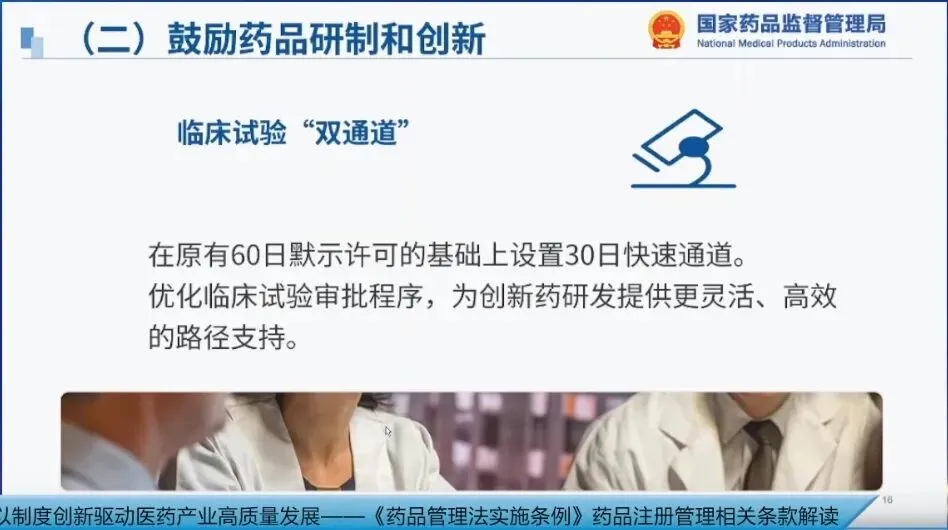 1. 优化临床试验审评审批。2024年,国家局在北京、上海组织开展优化创新药临床试验审评审批试点,在原有60日默示许可基础上,设置30日快速通道。试点一年来,探索建立了提升药物临床试验质量和效率的工作机制,试点结束后,我们总结评估试点成果并有效转化,明确临床试验30日通道的纳入条件和技术要求,在全国范围内推行。
