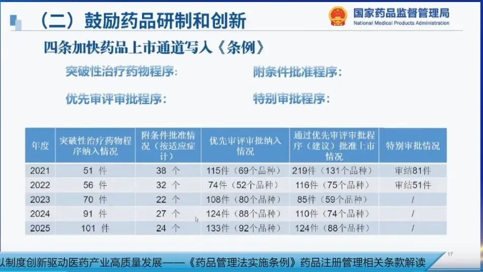 2020年至2025年,累计纳入突破性治疗药物程序395件、附条件批准品种159个、优先审评审批程序品种508个、特别审批程序品种132个,一大批临床急需药品通过这些通道实现优先审评审批,加快了产品上市进程。