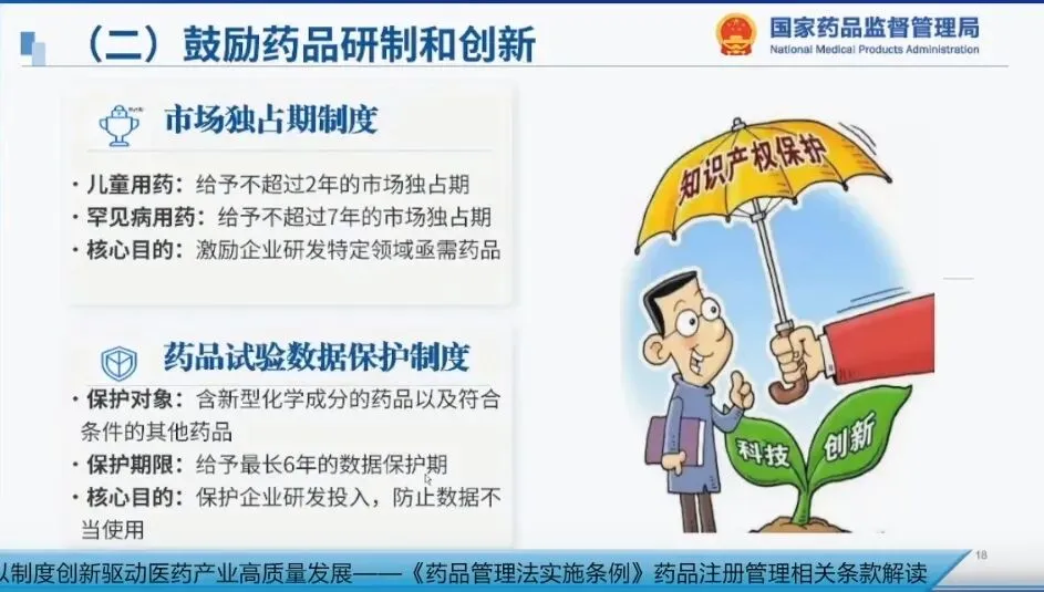 3. 完善药品实验数据保护制度。数据保护制度与市场独占期制度一样,都是鼓励创新、保护创新的重要举措。其中,数据保护的对象是含新型化学成分的药品以及符合条件的其他药品(需说明:中药有专门的《中药品种保护条例》,且保护力度更大、期限更长,因此数据保护制度不含中药)。