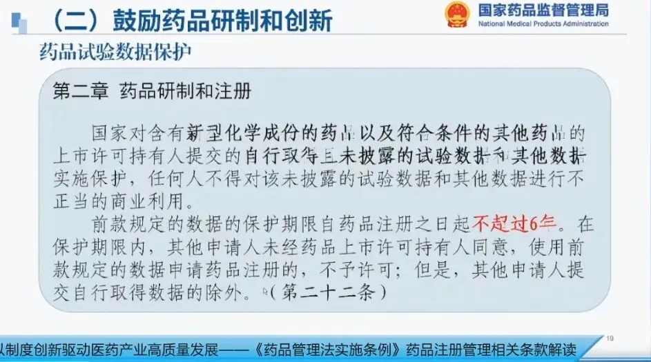 数据保护期限最长不超过6年,核心目的是保护企业研发投入,防止数据不当使用。药品实验数据保护独立于专利保护,主要保护研发者为获得上市许可而提交的未公开的重要研究数据,奖励研发者为获取这些数据付出的努力,给予其一段时间内的独占权,阻止他人使用该数据申请上市许可,这也是国际通行做法。