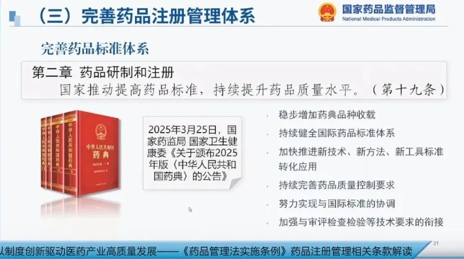 2025年3月25日,国家药监局和国家卫健委颁布《2025年版中国药典》,同年10月1日正式实施。2025版药典进一步强化了“以药典凡例为基本要求、通则为总体规定、指导原则为技术指导”的标准体系,强化源头和过程控制,逐步形成基于风险评估的质控模式;同时加大上市新药、儿童药、通过一致性评价品种的标准收载力度,加快推进新技术、新方法、新工具的标准转化,持续加强化学药品杂质控制,以及中药材和中药饮片的农药残留、重金属和有害物质限量、植物生长调节剂限量等安全性要求。