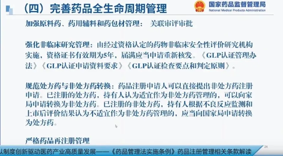 (1)原料药、辅料、包装材料关联审评已实施一段时间,下一步将持续优化完善;(2)非临床研究机构实行五年一认证制度,到期后仍需从事非临床研究的,需再次提出申请;(3)处方药与非处方药转换:申请者可在产品申报时按非处方药申报;已上市处方药若符合非处方药要求,可提出转换申请,经审评后完成转换;若非处方药在不良反应监测、药物警戒中发现不再适合作为非处方药,药监部门将督促企业转换为处方药;(4)再注册管理:目前大量药品批准文号需每五年进行一次再注册,国家局正在开展相关研究,考虑下一步实施分类管理举措,优化再注册流程。