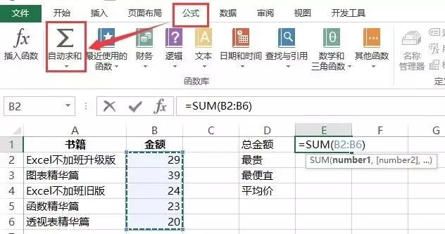 单击公式→自动求和,这时会自动出现SUM函数,自己用鼠标引用B2:B6这个区域就完成了统计。