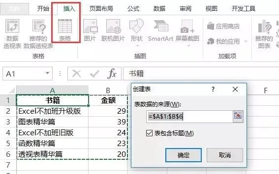 选择区域,单击插入→表格,保持默认不变,单击确定。
