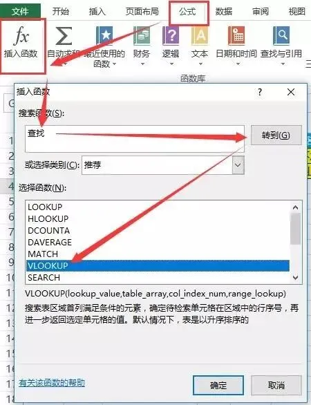 单击公式→插入函数,搜索关键词查找,转到,这时会发现VLOOKUP函数。