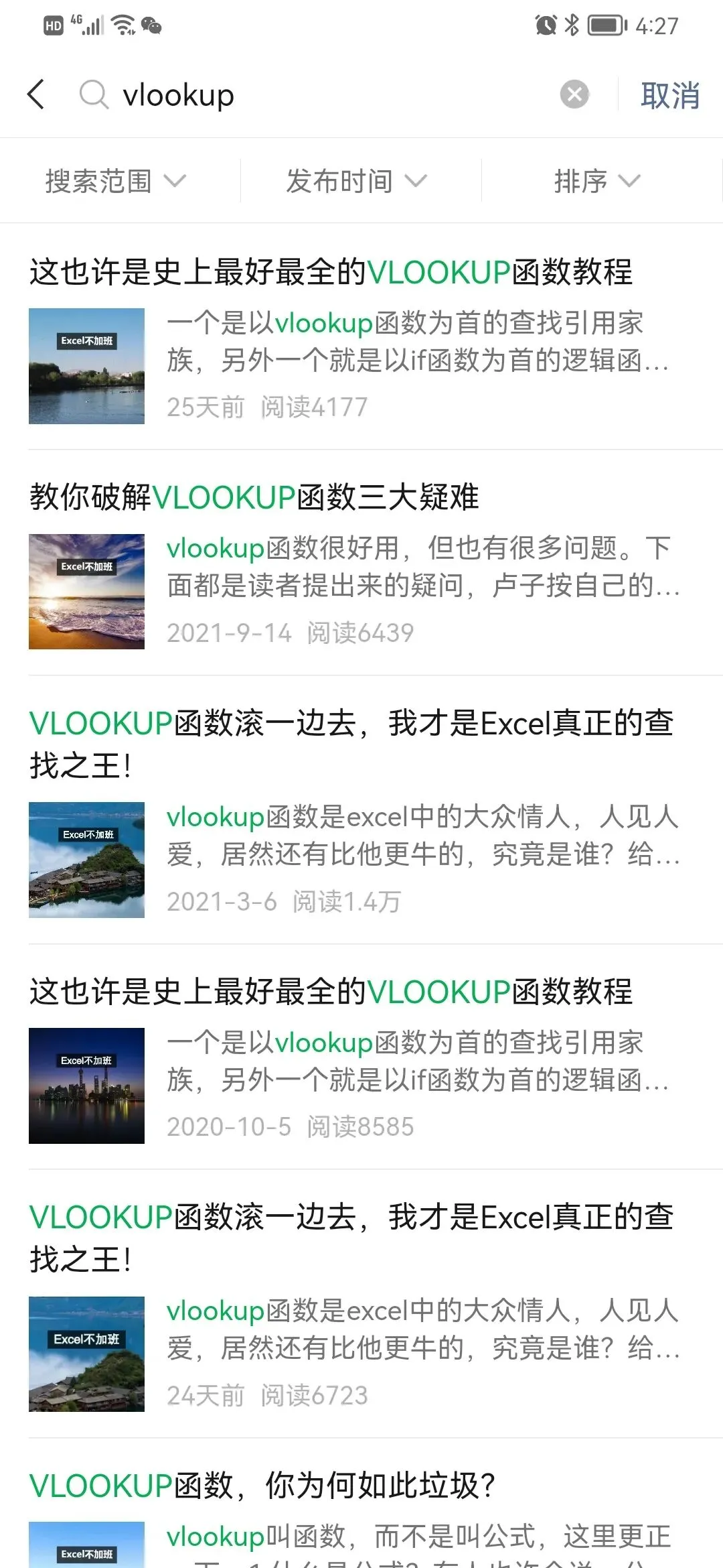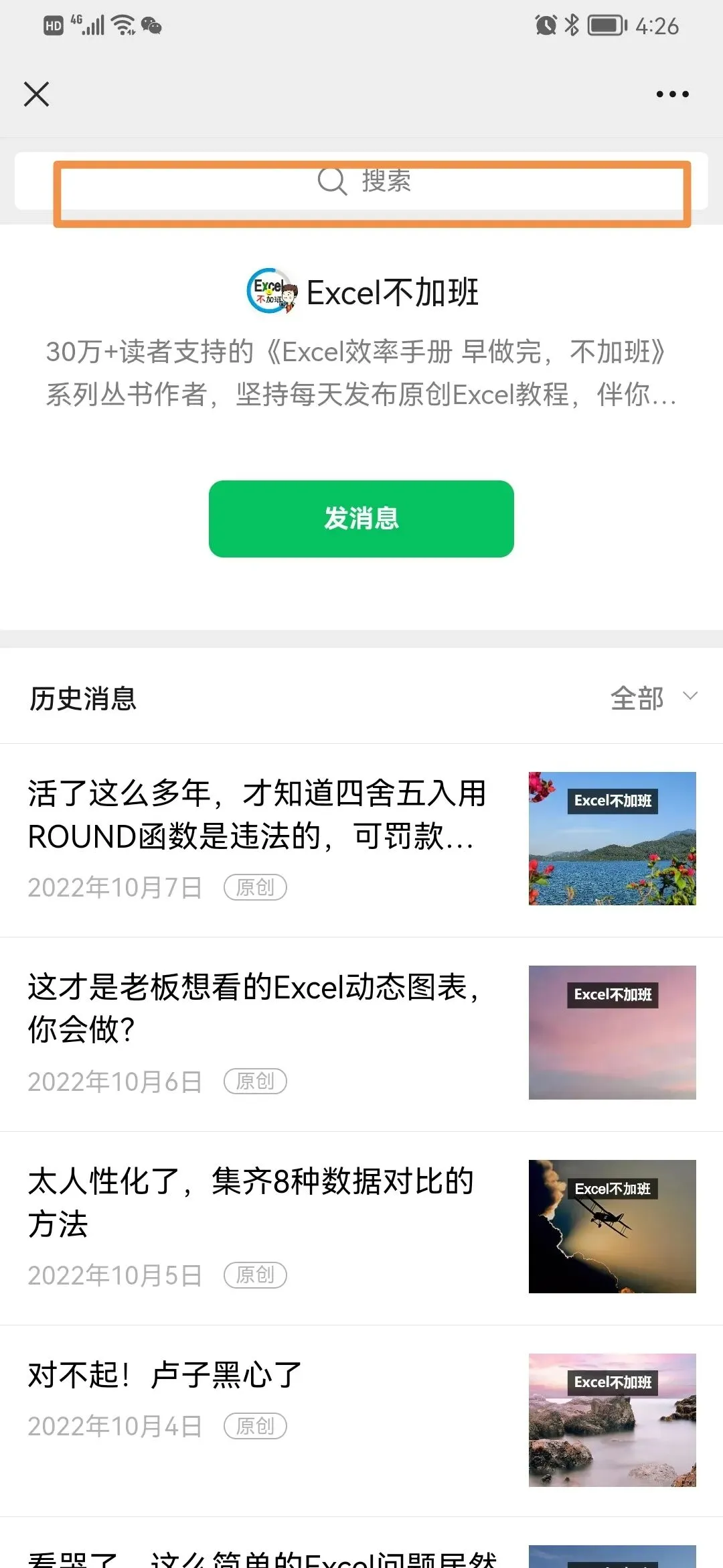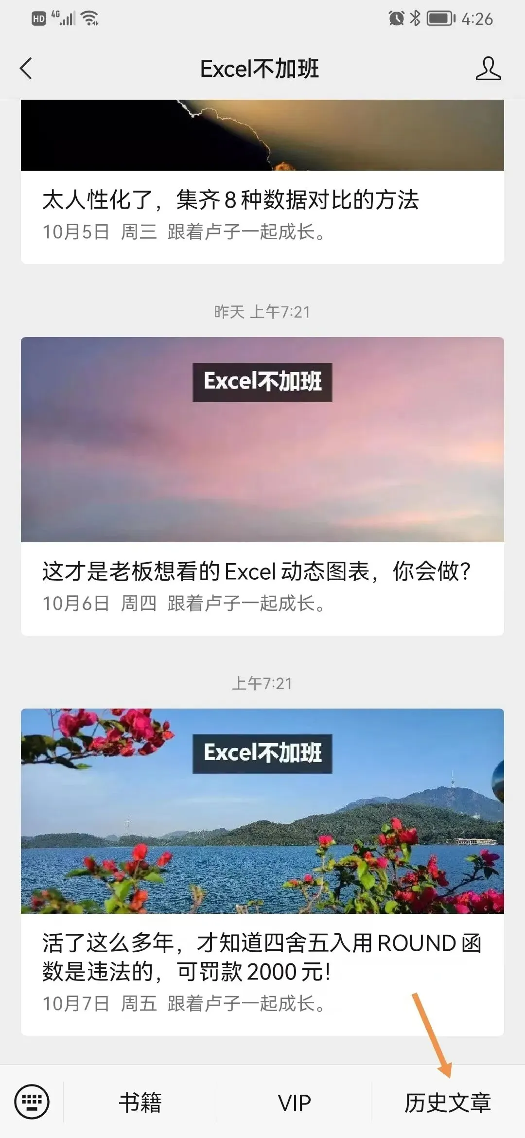 手机打开Excel不加班的公众号,在右下角点历史文章。