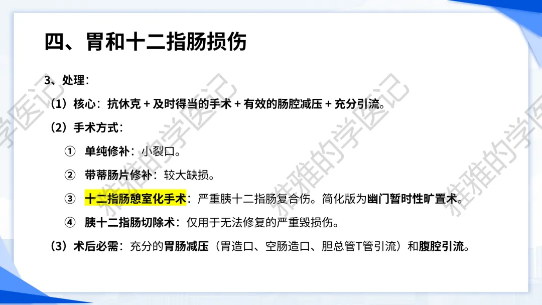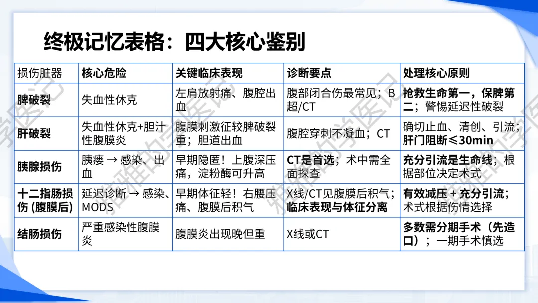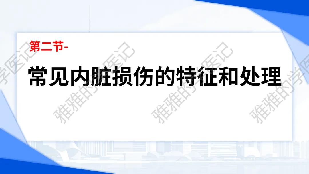 关注公众号,发送关键词“腹部损伤”获取信息!本次内容为:外科学(第10版),第7篇-腹部外科疾病,第2章-腹部损伤,第2节-常见内脏损伤的特征和处理。本PPT由本公众号精心制作,全面深入地了解腹部损伤这一重要议题。旨在与大家一同探讨学习,助力提升对腹部外科疾病的认知与实践水平。本演示文稿仅供教育和信息分享,不构成医疗建议。使用时请结合临床指南、专家共识及患者病情综合评估,医疗决策需咨询专业人员并参考最新研究成果。制作者和发布者对使用后果不承担责任,使用信息应遵循专业医疗实践规范,保障患者安全。