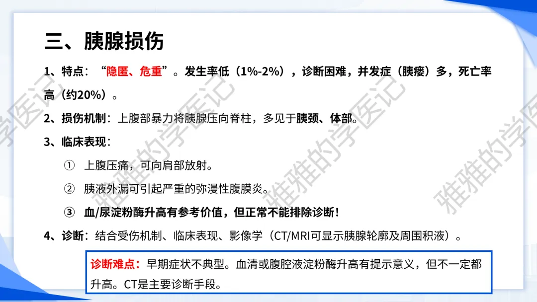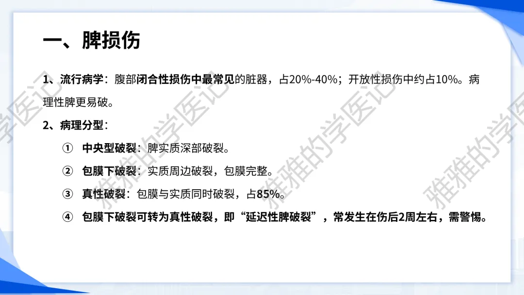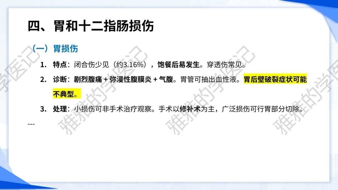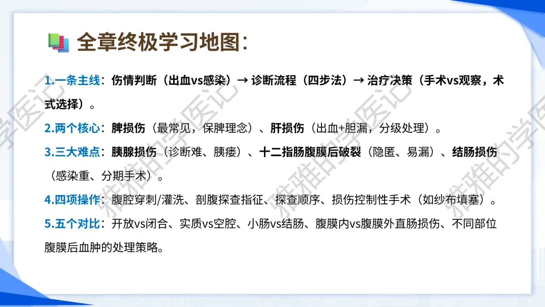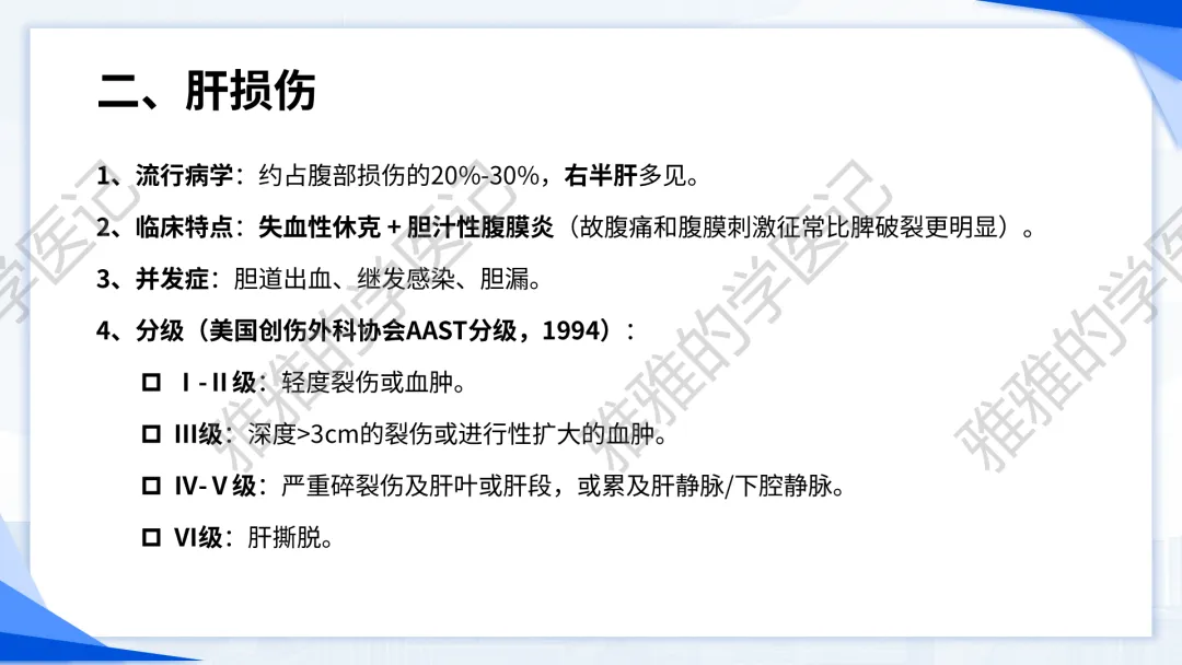 本PPT内容引用自《诊断学(人卫第9、10版)》等权威文献,PPT版权归本公众号所有,制作与审稿均由本公众号完成。关注公众号为“雅雅的学医记”,获取更多专业健康知识。这份PPT凝聚了专业知识与临床经验,对腹部损伤这一症状具有认识,并了解学习的意义,欢迎大家分享转发,共同学习,期待与大家的互动!目前学识有限,欢迎大家的指正。内容说明:腹部损伤,制作完成,目前正在公众号更新,需要笔记版请联系雅雅(免费)。后续更新内容:腹部损伤 · 终极学习指南(应试通关 & 临床实践版)。- 知识点,需要不断积累,并梳理整理为自己的。加油!书山有路勤为径,学海无涯苦作舟。(韩愈)