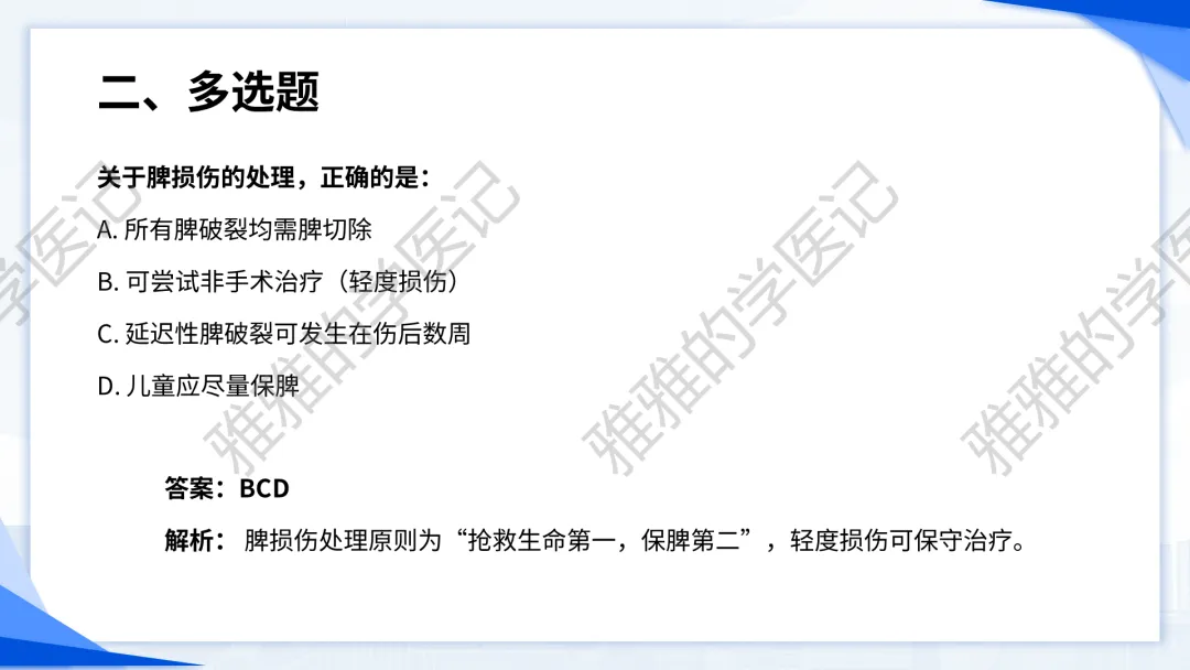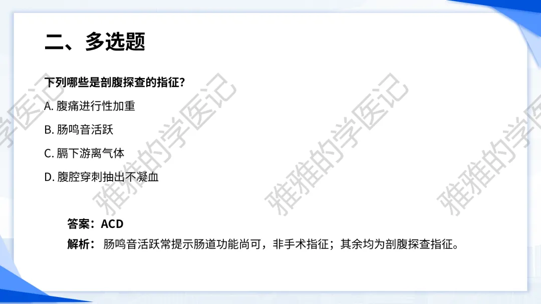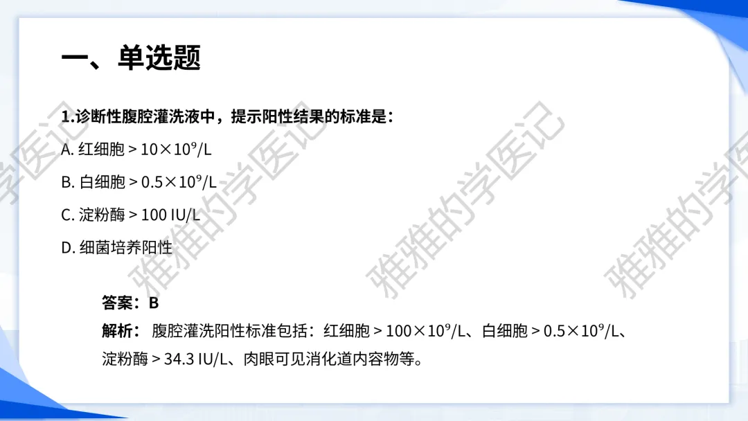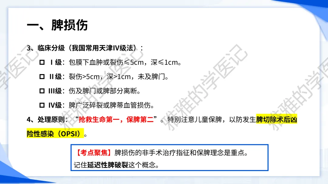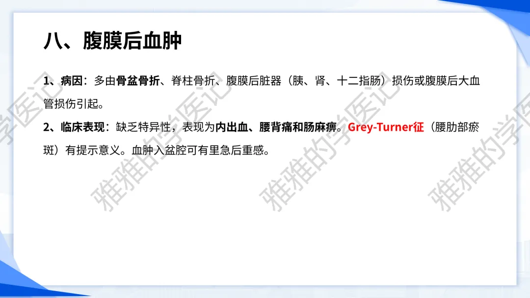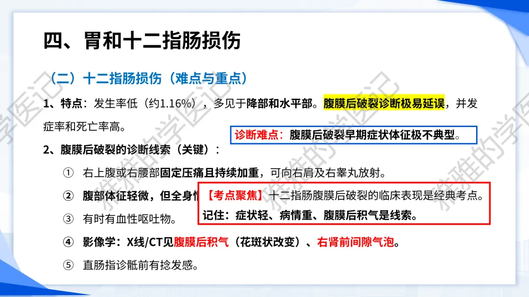 本PPT内容引用自《诊断学(人卫第9、10版)》等权威文献,PPT版权归本公众号所有,制作与审稿均由本公众号完成。关注公众号为“雅雅的学医记”,获取更多专业健康知识。这份PPT凝聚了专业知识与临床经验,对腹部损伤这一症状具有认识,并了解学习的意义,欢迎大家分享转发,共同学习,期待与大家的互动!目前学识有限,欢迎大家的指正。内容说明:腹部损伤,制作完成,目前正在公众号更新,需要笔记版请联系雅雅(免费)。后续更新内容:腹部损伤 · 终极学习指南(应试通关 & 临床实践版)。- 知识点,需要不断积累,并梳理整理为自己的。加油!书山有路勤为径,学海无涯苦作舟。(韩愈)
