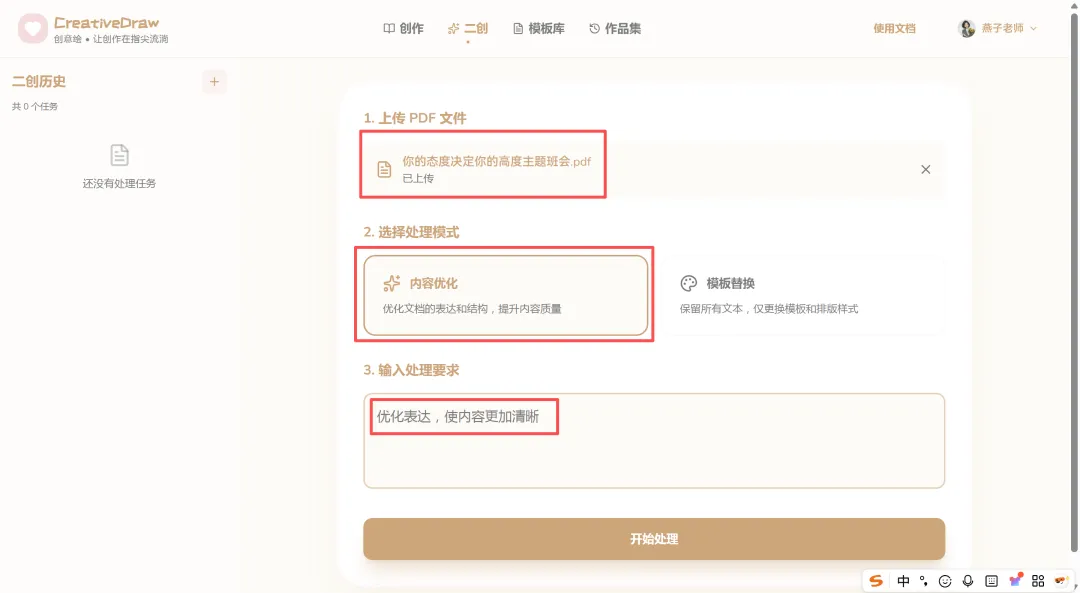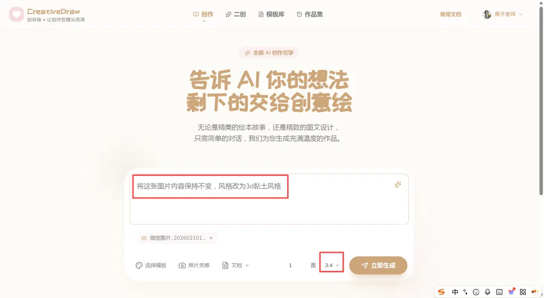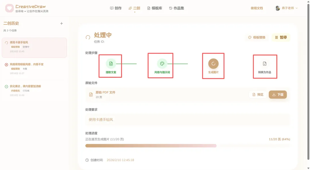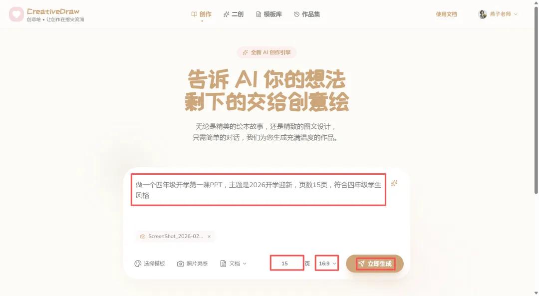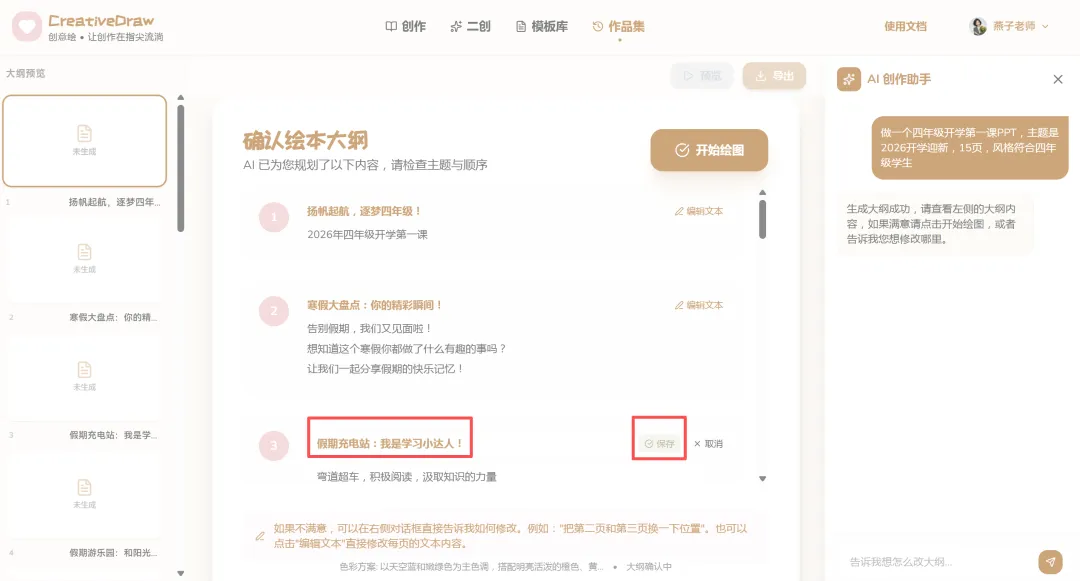 对我来说,掌握AI作图不再是一个可选项,而是必选项。创意绘的出现,正好解决了我的痛点:它不仅能把我的效率从2小时提升到3分钟,更重要的是,它生成的作品能直接拿去用,不用再反复修改。 上周,一个班主任客户找我,要一套“四年级2026开学迎新”的第一课PPT。放在以前,这至少要花我两天时间。 我只在创作界面输入了核心需求:“做一个四年级开学第一课PPT,主题是2026开学迎新”,完全不用绞尽脑汁构思复杂的提示词。 点击输入框旁的“魔法棒”,内置的AI引擎会自动分析我的需求,补全风格、场景、受众等关键信息,瞬间把一句普通的话,转化成了专业的创作指令。短短几十秒,一套逻辑清晰、排版精美的完整PPT就自动生成了。从封面、目录、课程目标,到课堂公约、健康生活建议,每一页都有精美的插画和清晰的文字。生成的PPT可以直接导出为PPTX文件,我只需要根据客户的要求微调一下文字和排版,就可以直接交付。以前两天的工作量,现在十几分钟就搞定了,我一天能接的单直接翻倍,利润也上去了。 除了日常接单,我还需要经常制作一些精品课件模板,用来吸引客户。手头有内容详实但排版过时的 PDF、Word 或图片资料?与其耗费精力重做,不如交给 AI 来完成“翻新”。CreativeDraw 的【二创功能】支持两种模式,精准满足不同需求。如果您希望在保持原有风格和图片基础不变的前提下,对文案内容进行润色和提升,选择【内容优化模式】。AI 将自动梳理逻辑,让旧文档的内容表达更上一层楼。想要保留原有文案,但彻底改变视觉风格?一键操作,即可将一份“老干部风”的文档瞬间切换为“手绘风”、“极简风”或任何您想要的风格,让旧文档焕发新生。我平时喜欢做一些知识卡片分享到小红书和抖音,用来引流和展示实力。创意绘同样是制作神器。无需设计基础,利用【智能模板库】即可轻松复刻爆款风格。实战演示:3D 黏土风海报