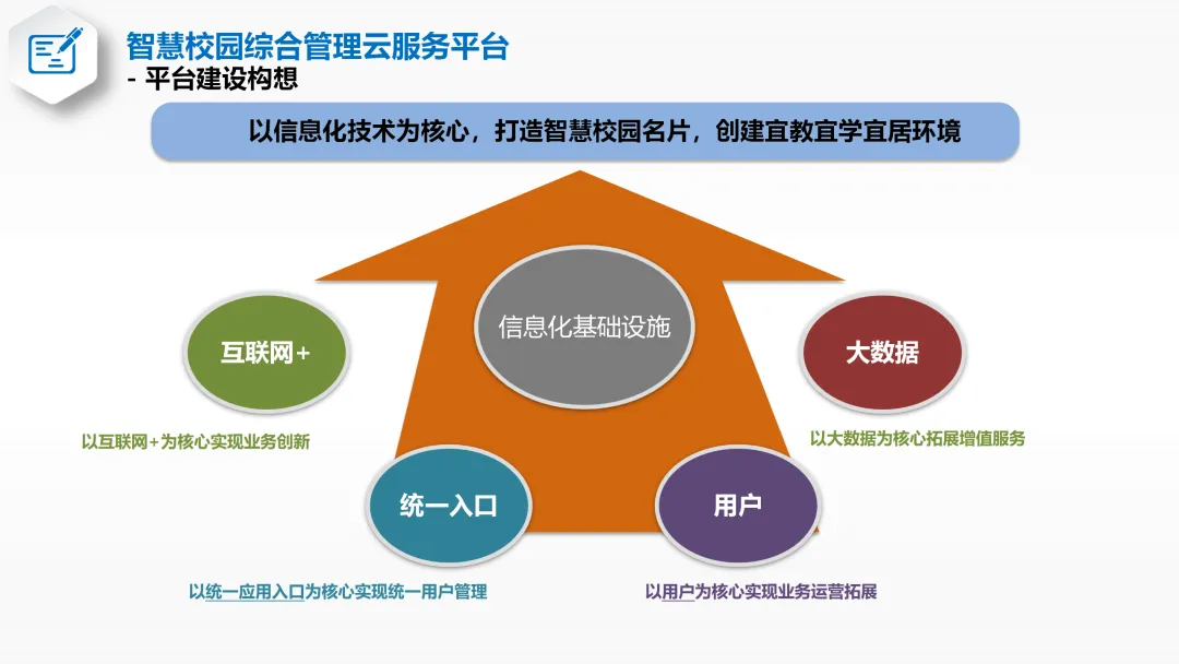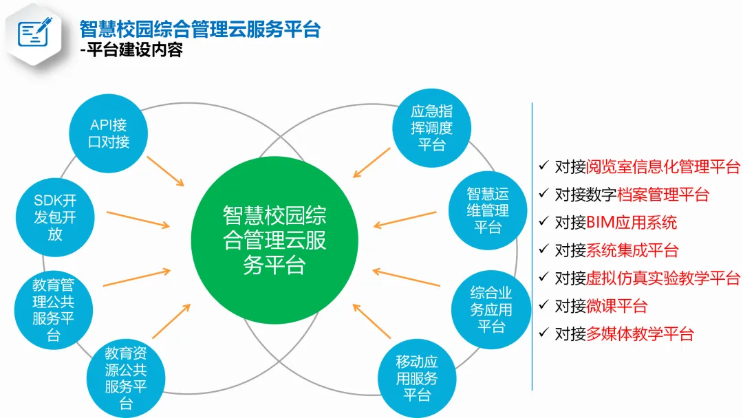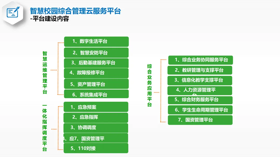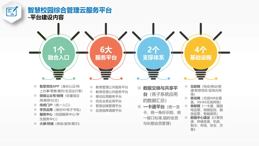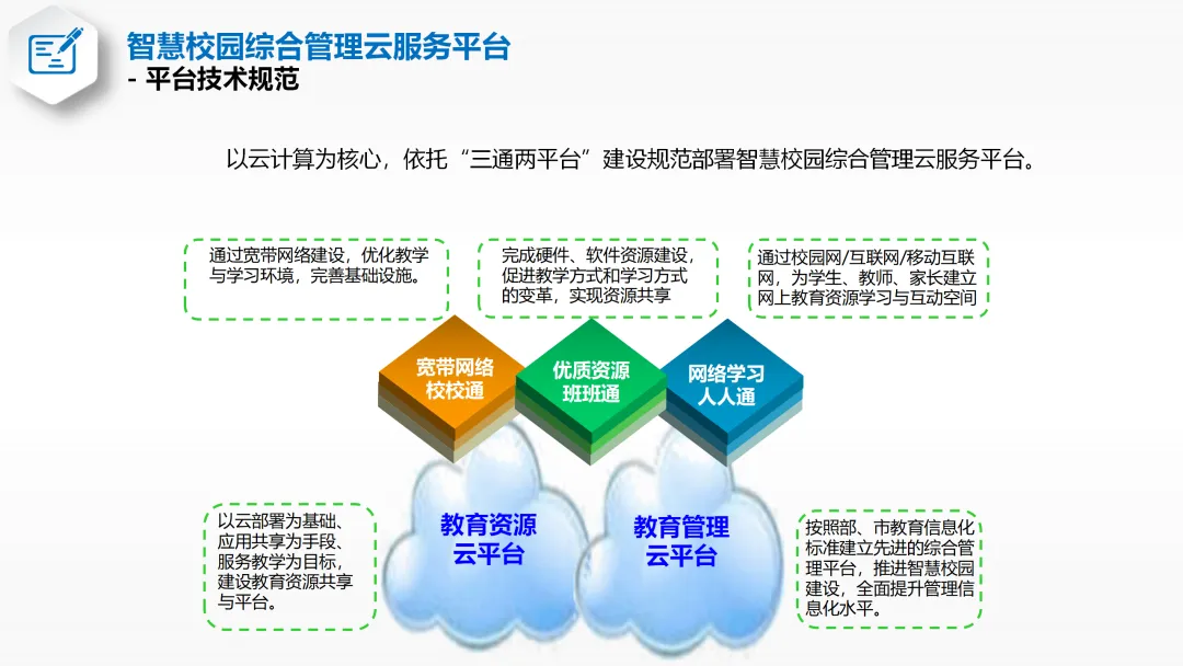 方案首先分析了智慧校园的背景与现状,明确了智慧校园建设的必要性与紧迫性。随后,提出了智慧校园的综合管理云服务平台架构,涵盖教育管理、教育资源、移动应用、综合业务、智慧运维及应急指挥等多个服务平台,实现校园业务的全面数字化与智能化。