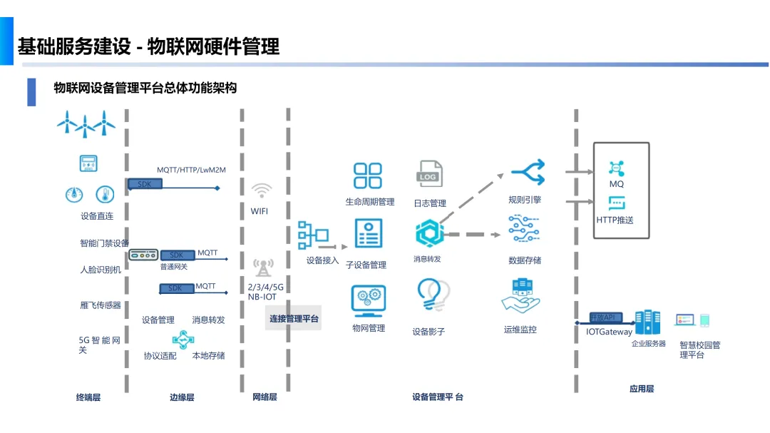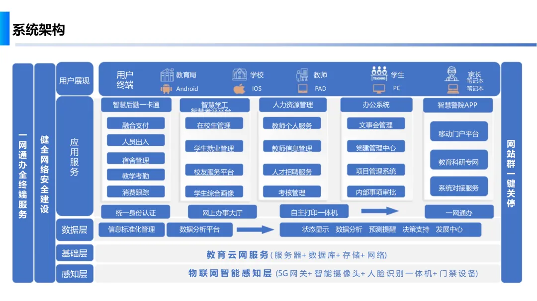 方案首先构建了智慧校园的系统架构,涵盖教育云网服务、物联网智能感知层、应用中心及感知中心等多个层面,确保校园网络的稳定与安全。在基础服务建设方面,方案强调了物联网硬件管理、一网通办、数据中台及网站群建设的重要性,通过统一身份认证和智能设备接入,提升校园管理效率。