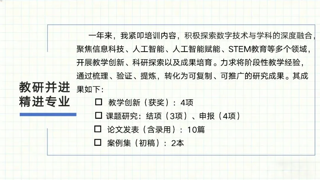 魏鹏飞老师的年度汇报PPT做的这么好,不仅成果丰富,且文采斐然,更重要的是在清晰的成长思路引领之下的富含文韵的布局、行文,图文之间给我们信科老师带来新的力量!