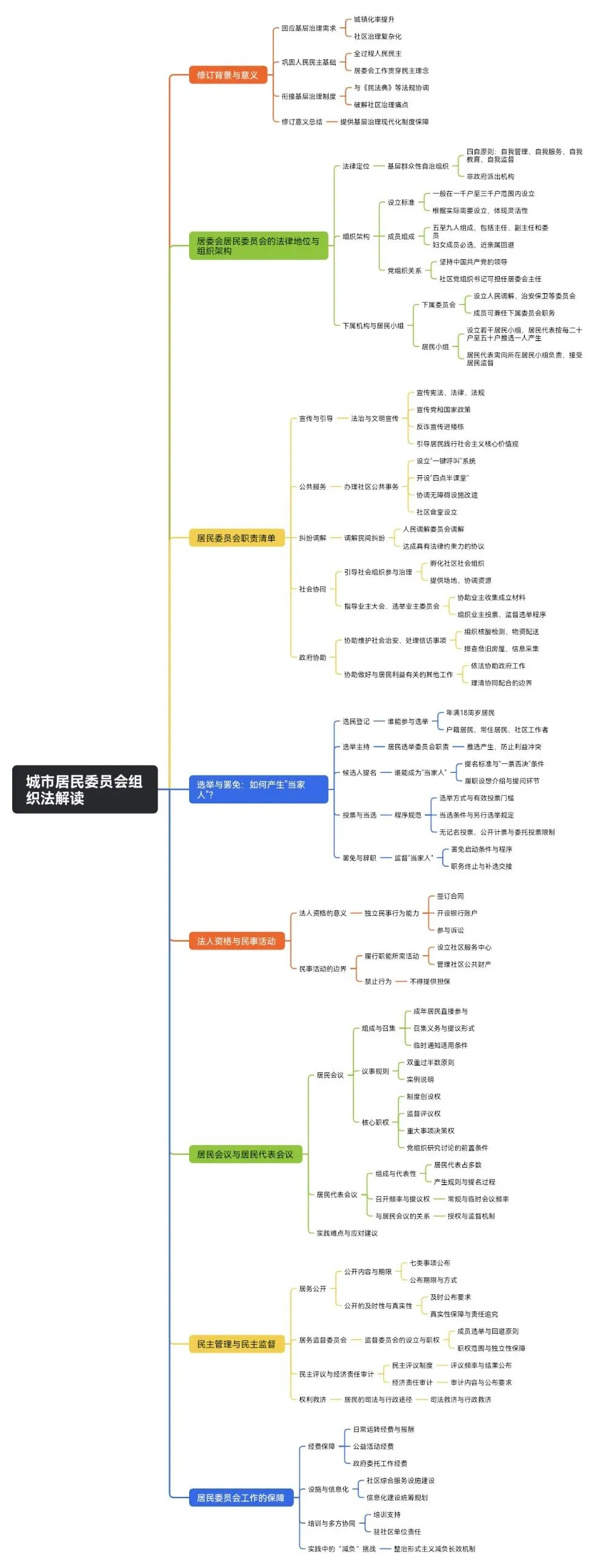 3.与党组织的关系:第四条强调"居民委员会工作坚持中国共产党的领导",并规定"社区党组织领导和支持居民委员会行使职权"。实践中,很多社区已推行"一肩挑"(社区党组织书记通过法定程序担任居民委员会主任),本次修订明确"居民委员会主任可以由社区党组织负责人通过法定程序担任"(第八条第三款),并允许"成员和社区党组织领导班子成员交叉任职",强化了党对基层自治的领导核心作用。