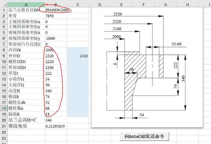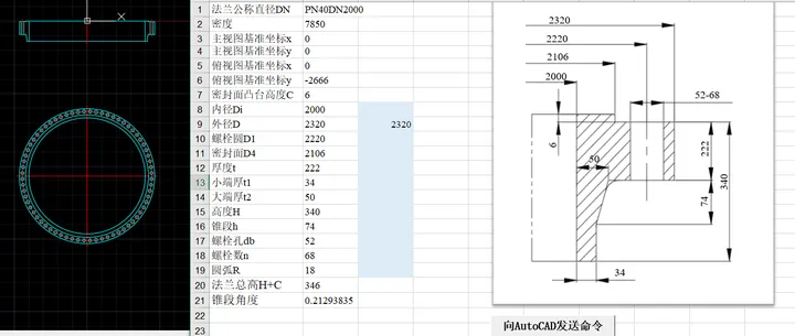 如果法兰尺寸不是标准值,可以在蓝灰色单元格中输入一个值实现修改,比如D=2315改为2320。通过文本将尺寸显示到法兰图片上。