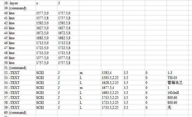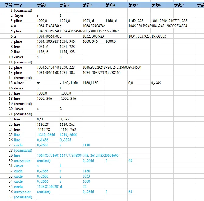 表格总体如下图所示,计算了60个关键点,命令流68行。点击绘图键后10秒内完成绘图加明细表,这个速度相比专业插件是慢的,但是比设计员自己画还是快很多,可用。