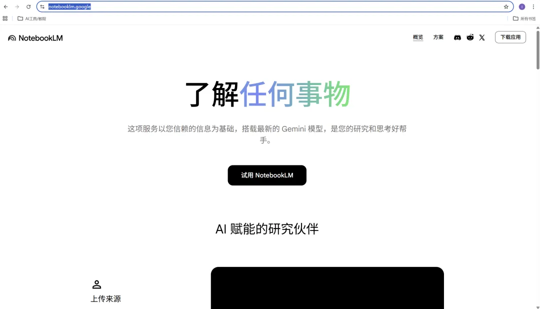 满足条件后,访问官方网站:https://notebooklm.google.com/,点击 “试用 NotebookLM” 进入功能界面。