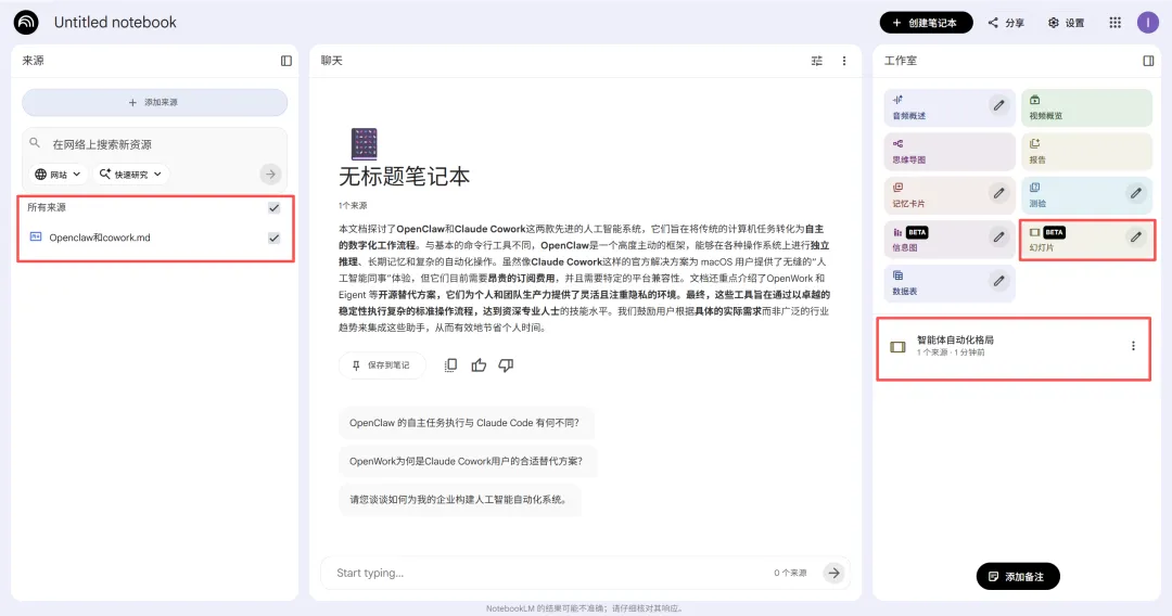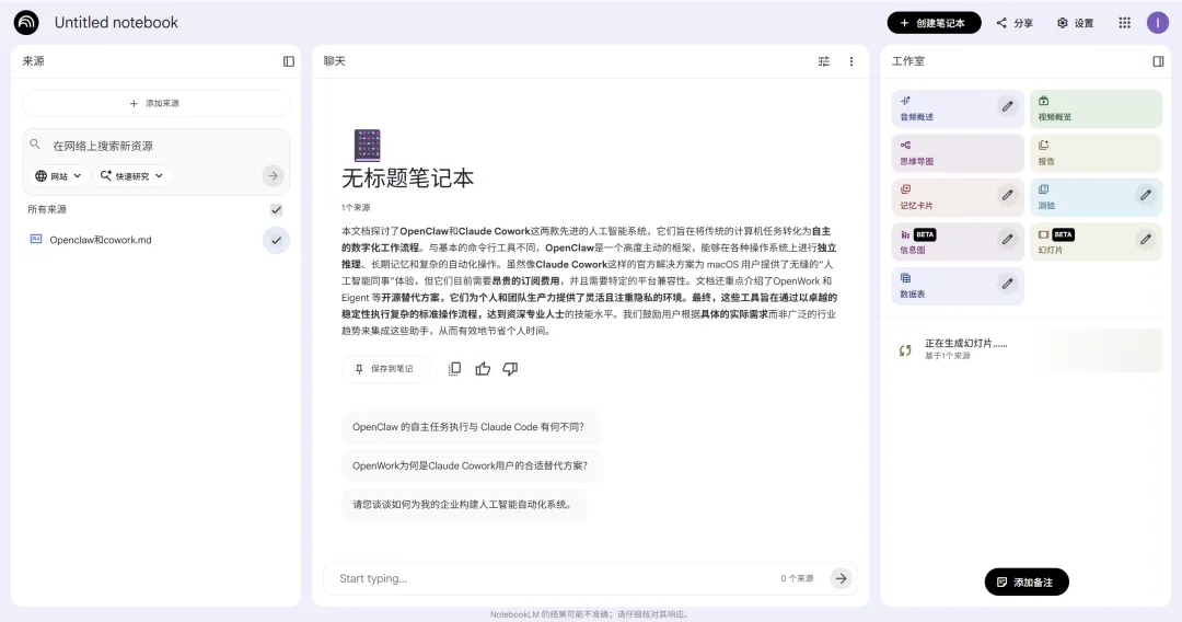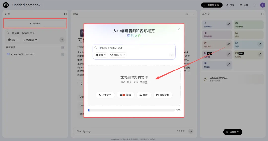 新建笔记本:打开 NotebookLM 后,点击左侧 “新建笔记本”,该笔记本作为专属 “学习工作室”。