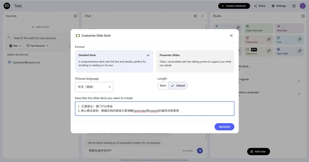 输入提示词(万能通用 PPT 生成指令模板如下):