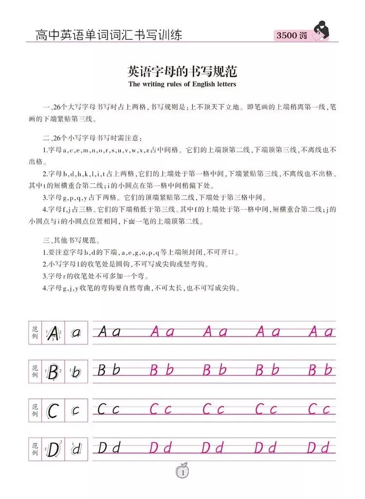1.字母字形,每一个字母有它自己形状,不可多一笔也不可少一笔,是什么样就写什么样。