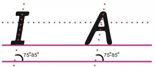 6.字母斜度,即字母与一线格的夹角,规范书写下的字母与线之间的夹角为75-85度。