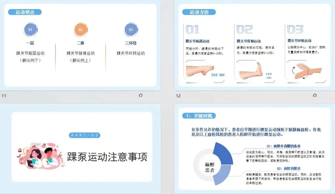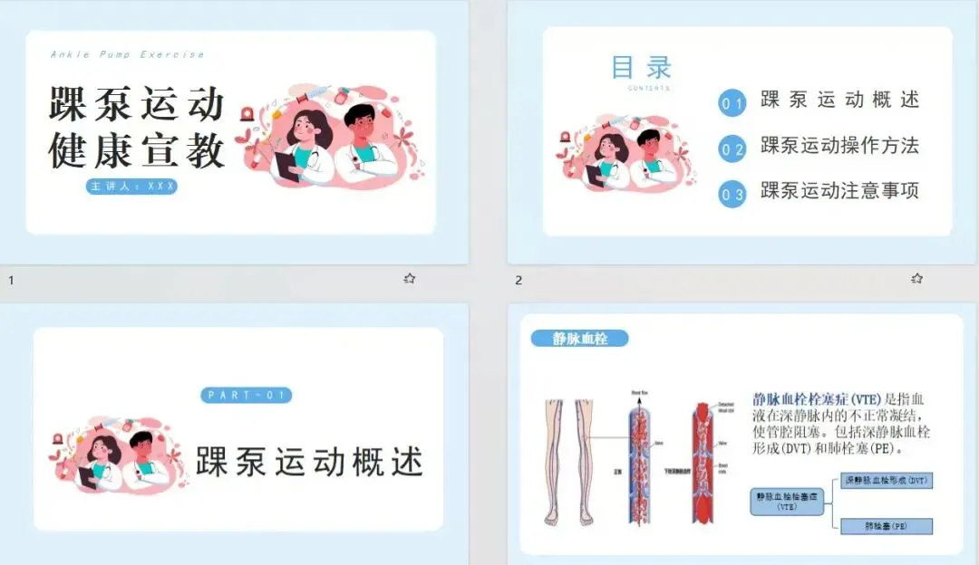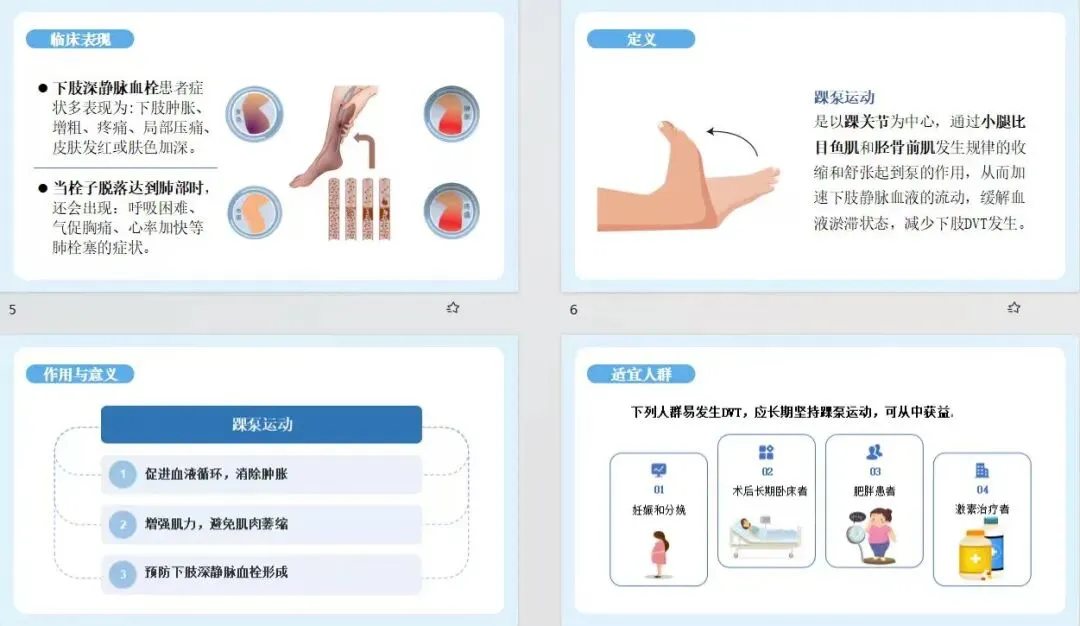 内容:静脉血栓概述、临床表现、踝泵运动定义、作用与意义、适宜人群、禁忌人群、运动要点、运动方法、注意事项