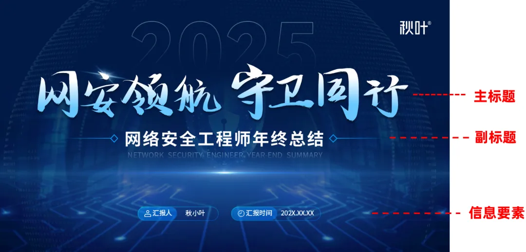 PPT 封面页内容一般有主标题、副标题、汇报人、汇报时间等信息要素,我们一个个来看。