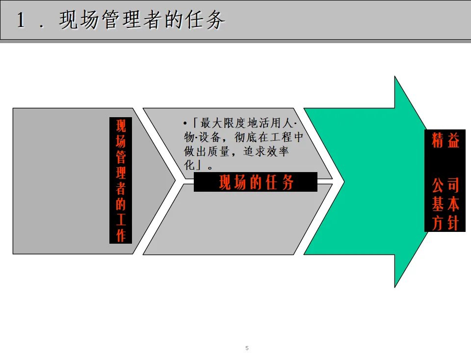"最大限度地活用人、物、设备,彻底在工程中做出质量,追求效率化。"