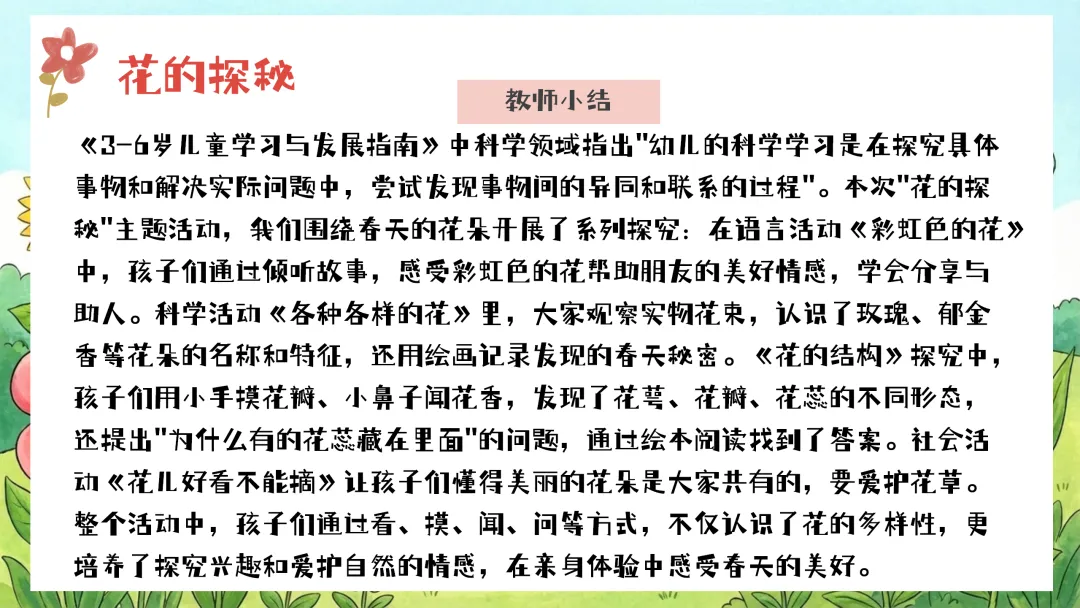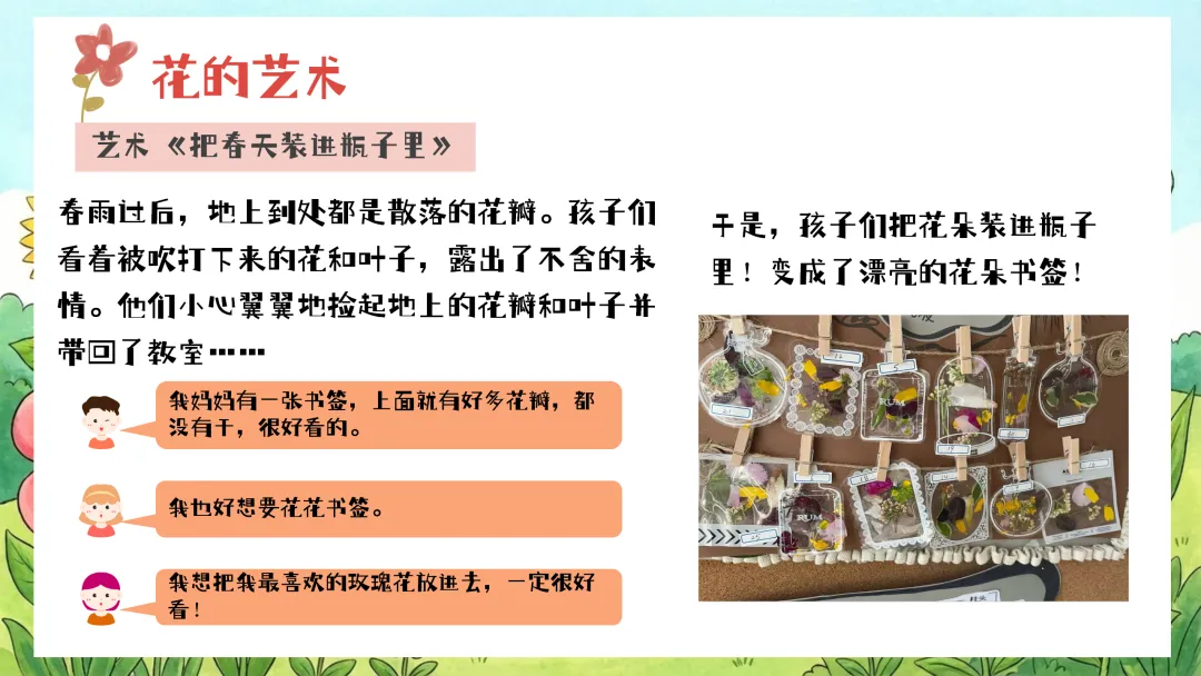 情境回忆,激发兴趣:教师微笑着提问:“小朋友们,我们之前一起做了漂亮的花朵书签,还记得吗?在制作书签的时候,我们剩下了好多可爱的小花小草,它们还能变成什么呢?”引导幼儿自由讨论,鼓励他们大胆表达自己的想法。