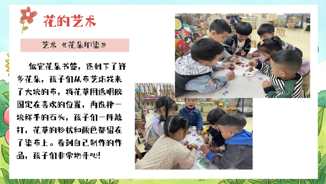 教师:“今天我们就要用这些剩下的小花小草,还有布和石头,来做一个神奇的花朵印染。”