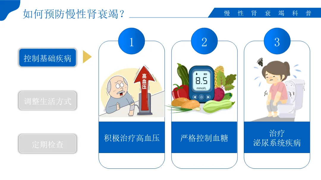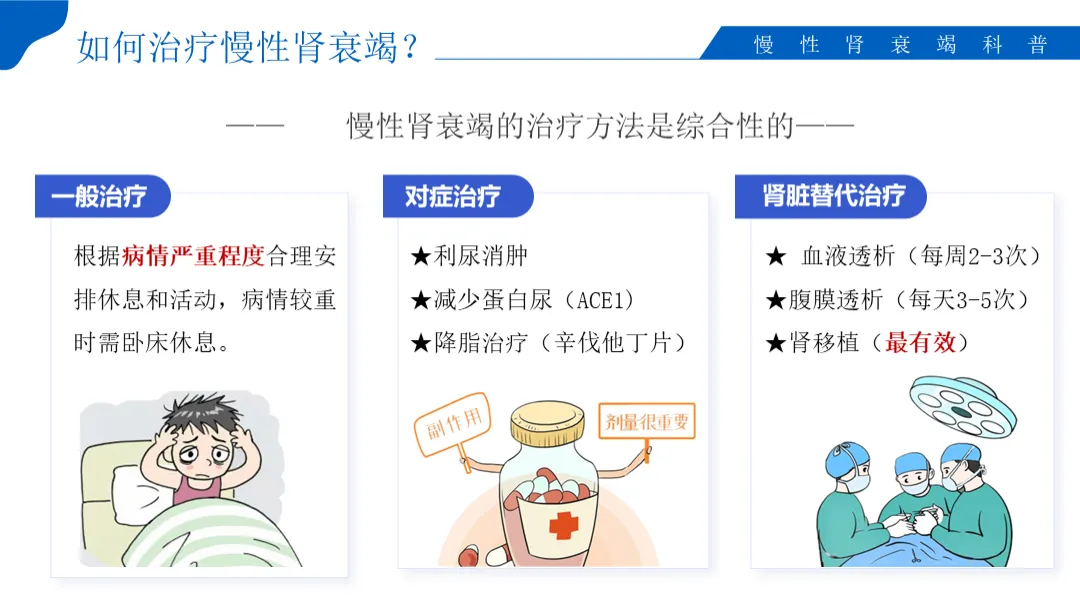 治疗不是单一手段,而是综合性管理。包括控制原发病、合理用药、饮食调控,必要时进行透析或肾移植。目标是延缓病程、改善症状、提高生活质量。